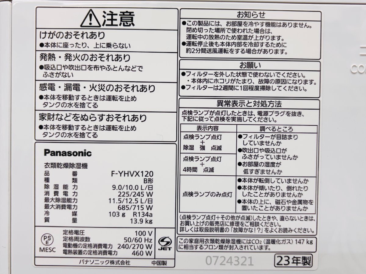 | こちらの商品は在庫管理の都合上、手渡し不可・配送対応のみとなります。 メーカー・・・パナソニック Panasonic 型番・・・F-YHVX120 年式・・・2023年製 シリアルナンバー・・・0724321 サイズ・・・W:約35cm、D:約22cm、H:約57cm 色・・・ 白系 仕様 ○除湿可能面積目安(50Hz/60Hz) ・木造11畳/13畳 ・プレハブ17畳/19畳 ・鉄筋23畳/25畳 ○最大除湿能力(50Hz/60Hz) 11.5L/日・12.5L/日 ○定格除湿能力(50Hz/60Hz) 9.0L/日・10.0L/日 コメント・・・動作確認済みです。キズやシミなどは見当たらず、非常に綺麗な状態です。 その他、画像をご確認ください。ノークレームノーリターンでお願いいたします。 付属品・・・画像の物が全てです。 ※画像は撮影機器や閲覧機器により実際の色味と多少異なる場合がございます。 ※1枚目の画像はメーカーから取り入れたイメージ画像となる場合がございます。 ●●●●●●●●●● 商品番号F202 ●●●●●●●●●● 簡易動作確認★★★( B 番)★★★ A 正常動作品・・・動作に不具合・不良・故障がない品 B 確認済み・・・運転/停止などの基本的な動作には問題がなかった品 C 難あり・・・基本的な動作はするがコツがいる、不具合・不良がある品 D 通電確認のみ・・・電源が入ることのみ確認済みの現状品 E 未確認・・・通電及び動作の確認がとれていない現状品 J ジャンク品・・・故障や破損により動作しない品 ※評価の基準のつきましては注意事項をご覧ください。 ●●●●●●●●●● 程度★★★( 2番)★★★ 1 美品・・・使用感がほとんどなく美品 2 良品・・・多少キズ等はあるが全体的には良い状態 3 並品・・・キズ等が多々あるが全体的には良い状態 4 並下・・・使用感ありキズ等もある 5 ジャンク品・・・何処かが故障していたり破損していたりする物 ※評価は個人的な主観で判断したものですで目安としてお考え下さい ※個々美的感覚が違いますので見方によっては傷になるものも有ります ●●●●●●●●●● 出品中の商品のご質問はこちらのアドレス宛に下さい tosholtd_big1@yahoo.co.jp システムの都合上、通常出品欄からのご質問には答えられませんのでご了承下さい。 ご質問の場合以下を例にして下さい メールタイトル欄に 質問 と入れてください。 本文に オークションタイトル 質問内容 を明記の上お問い合わせください。 | ||