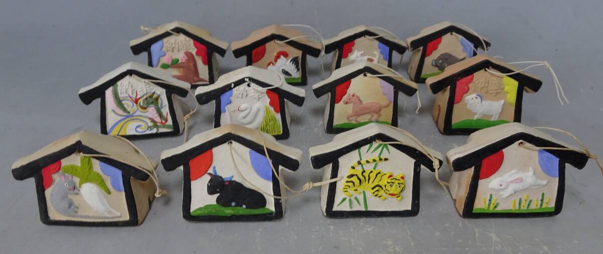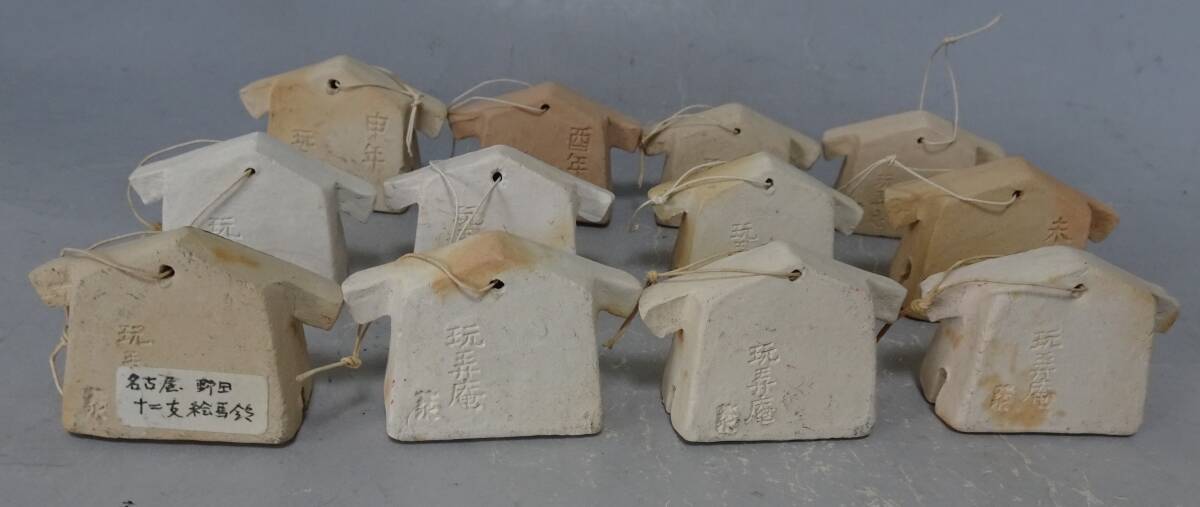 名古屋土人形、野田末吉さんの絵馬型十二支土鈴12個揃いです。4×5・5センチ、綺麗に保存されていて、全くの新品状態です。