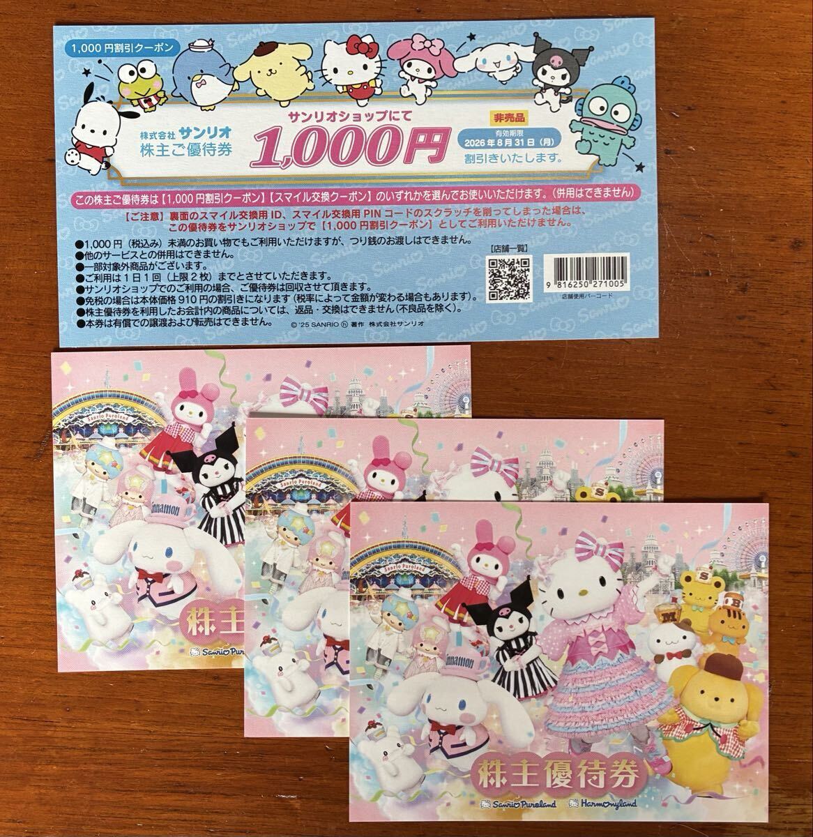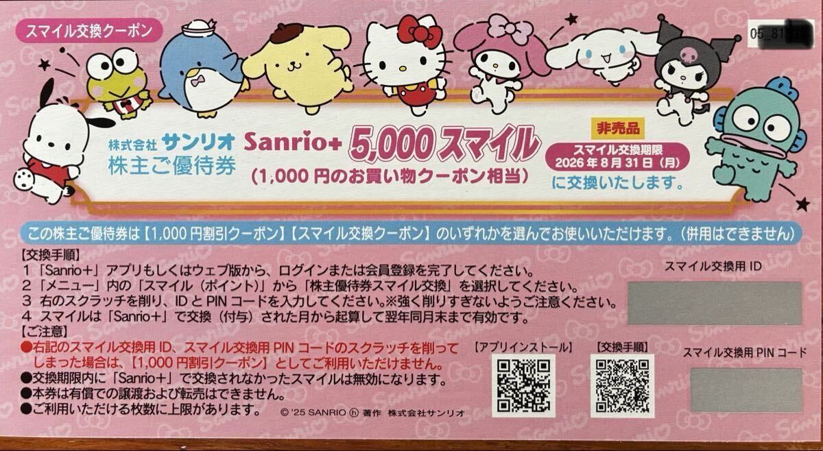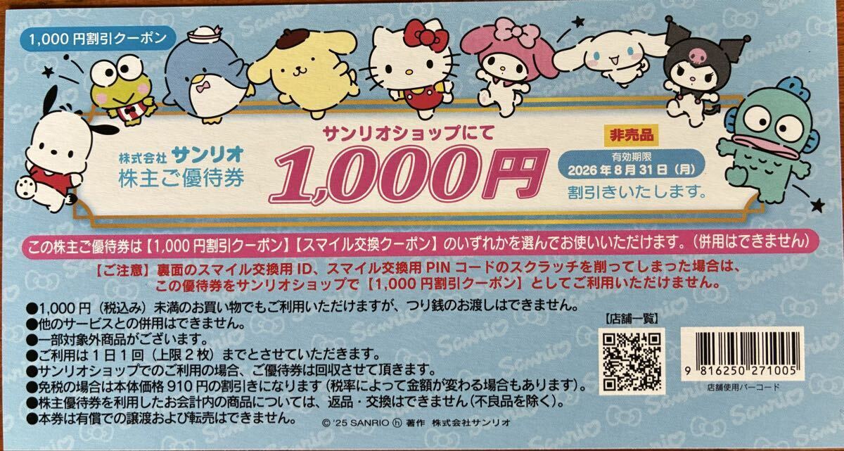 サンリオショップで利用できる1000円割引券(または、サンリオ5000スマイルと交換可能)もおつけします
