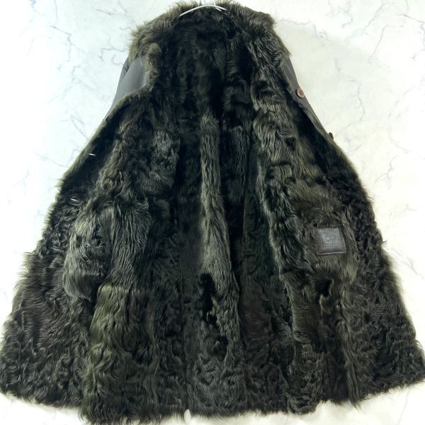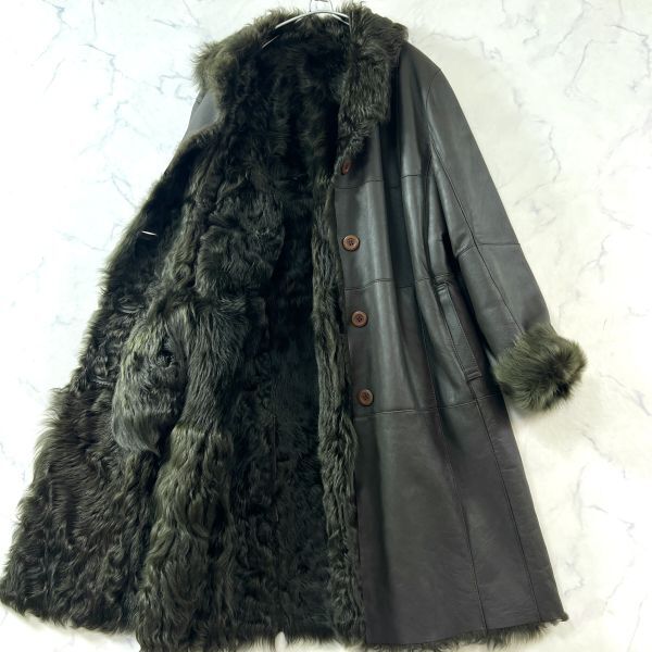 【XL】極美品 本革 ロングリアルムートンコート リアルファー レザージャケット 毛足長め羊革 ダークグリーン セシオセラ レディース B1759