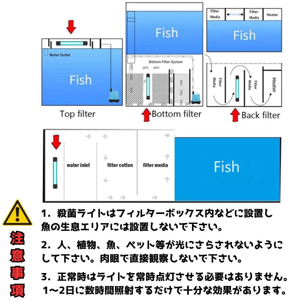 ・UVライトはフィルターボックス内などに設置し魚の生息エリアには設置しないで下さい。