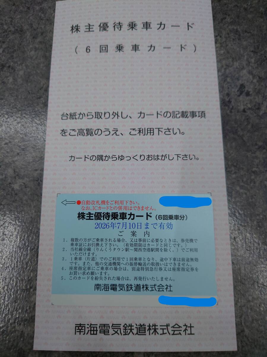 南海電気鉄道株主優待乗車カード 6回分の出品です。