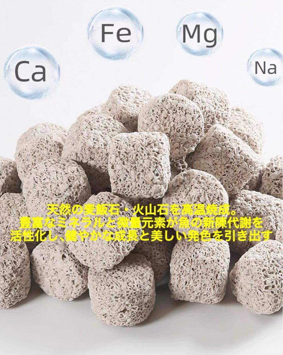 豊富なミネラルと微量元素が魚の新陳代謝を活性化し、健やかな成長と美しい発色を引き出します。
