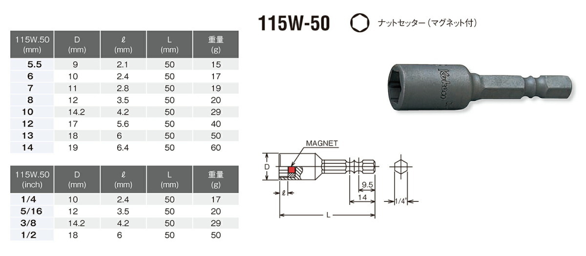 〈コーケン〉ナットセッター(マグネット付)  115W-50-3/8