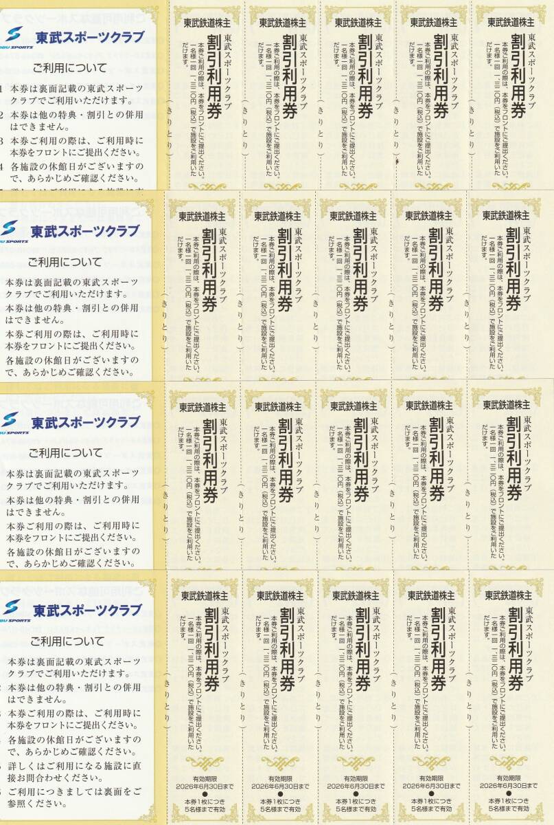 | ●東武スポーツクラブ割引利用券です。 ●有効期限は2026年6月30日までです。 ●入札価格は割引券4シート(20枚セット)の価格です。 ●お支払金額は、落札価格+送料になります。 | ||