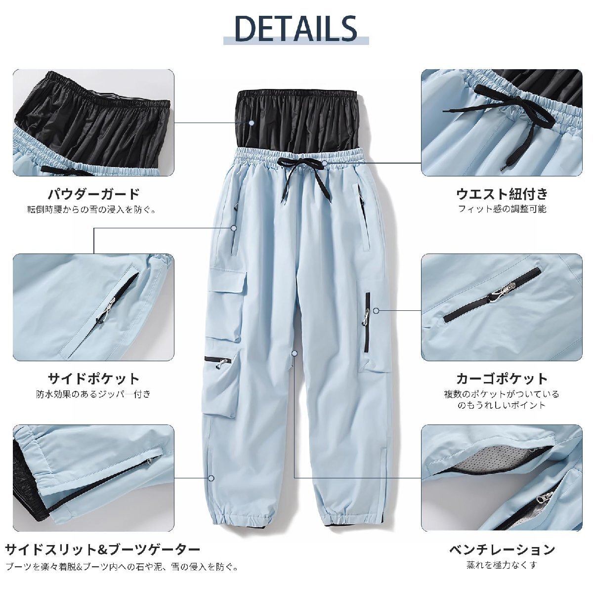 【機能性満載】立体裁断の採用により足の動きへの機動性と快適性を追求ているので窮屈さを感じさせません。ウエスト部分は弾性ゴムバンド入り、脱着がやすい。ウェスト紐も付き、お好みのサイズに。サイドスリットあり、ブーツを楽々着脱便利。複数のポケットがついているのもうれしいポイントです。