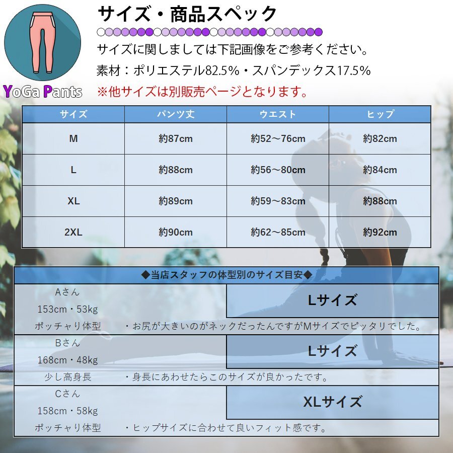 | 商品名:ヨガウェア ボトムス サイズ:画像内のサイズ表をご参照ください。 生産地:中国 カラー展開:7色展開 サイズ展開:Mサイズ・Lサイズ・XLサイズ・2XLサイズ 素材:ポリエステル82.5%、ポリウレタン17.5% |