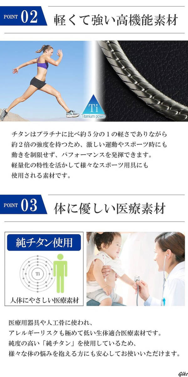・特長:金属アレルギー対応、軽量、変色しにくい、高耐久、日本製、シンプルデザイン