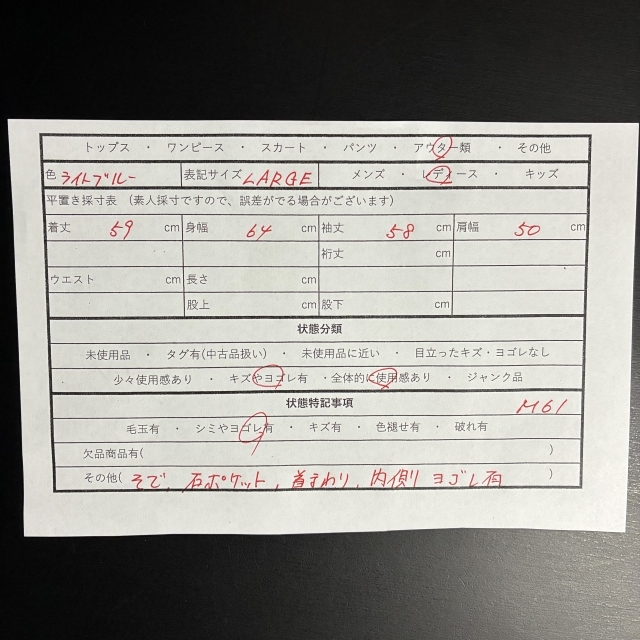 ・その他(そで、右ポケット、首まわり、内側 ヨゴレ有)