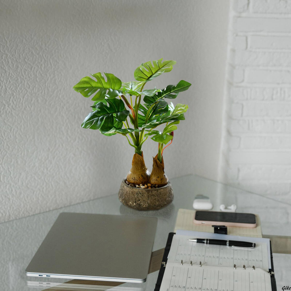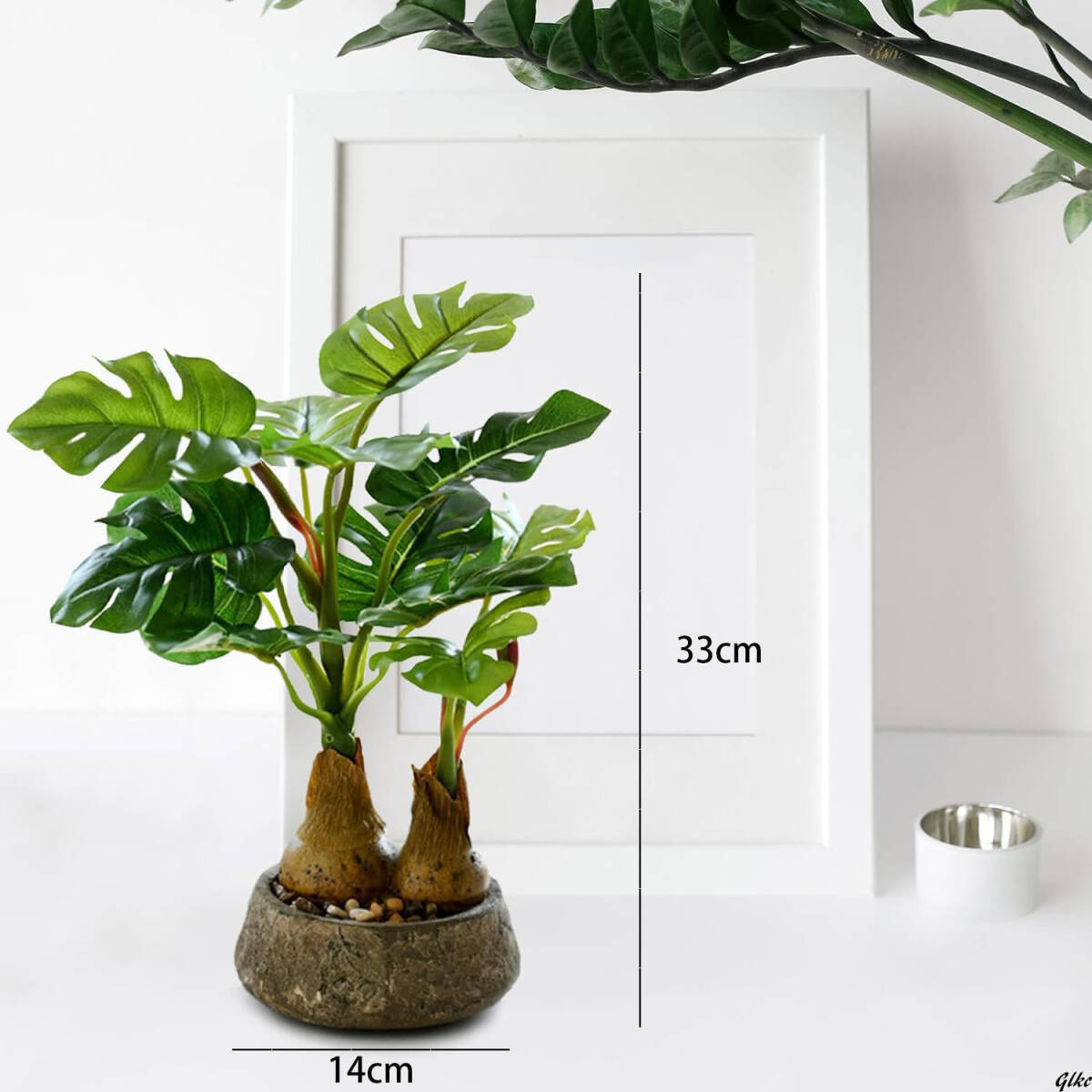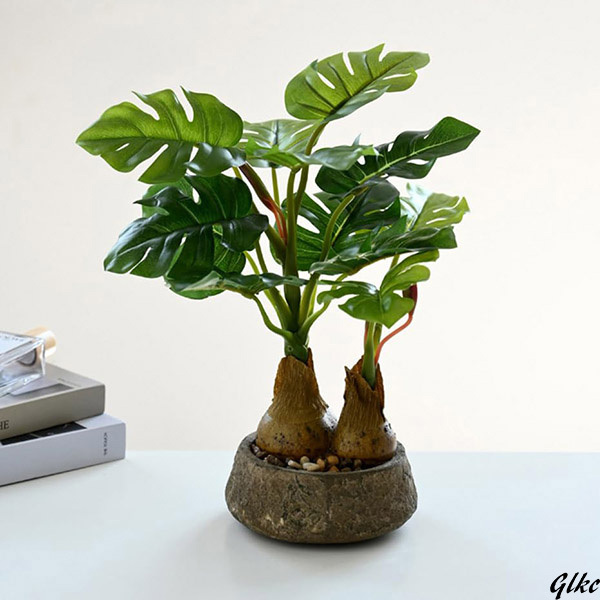 このフェイクグリーンは、人工盆栽として人気のモンステラを使用し、室内や屋外のインテリアにぴったりなデザインです。
