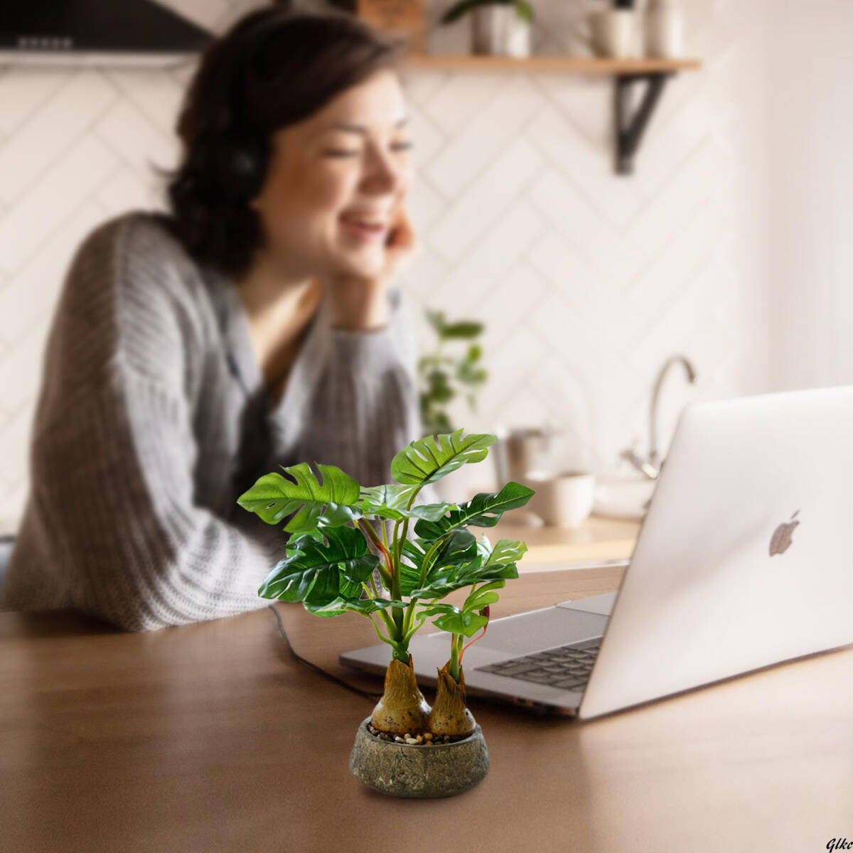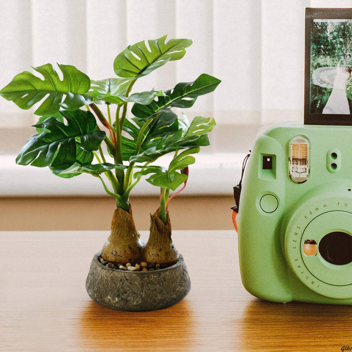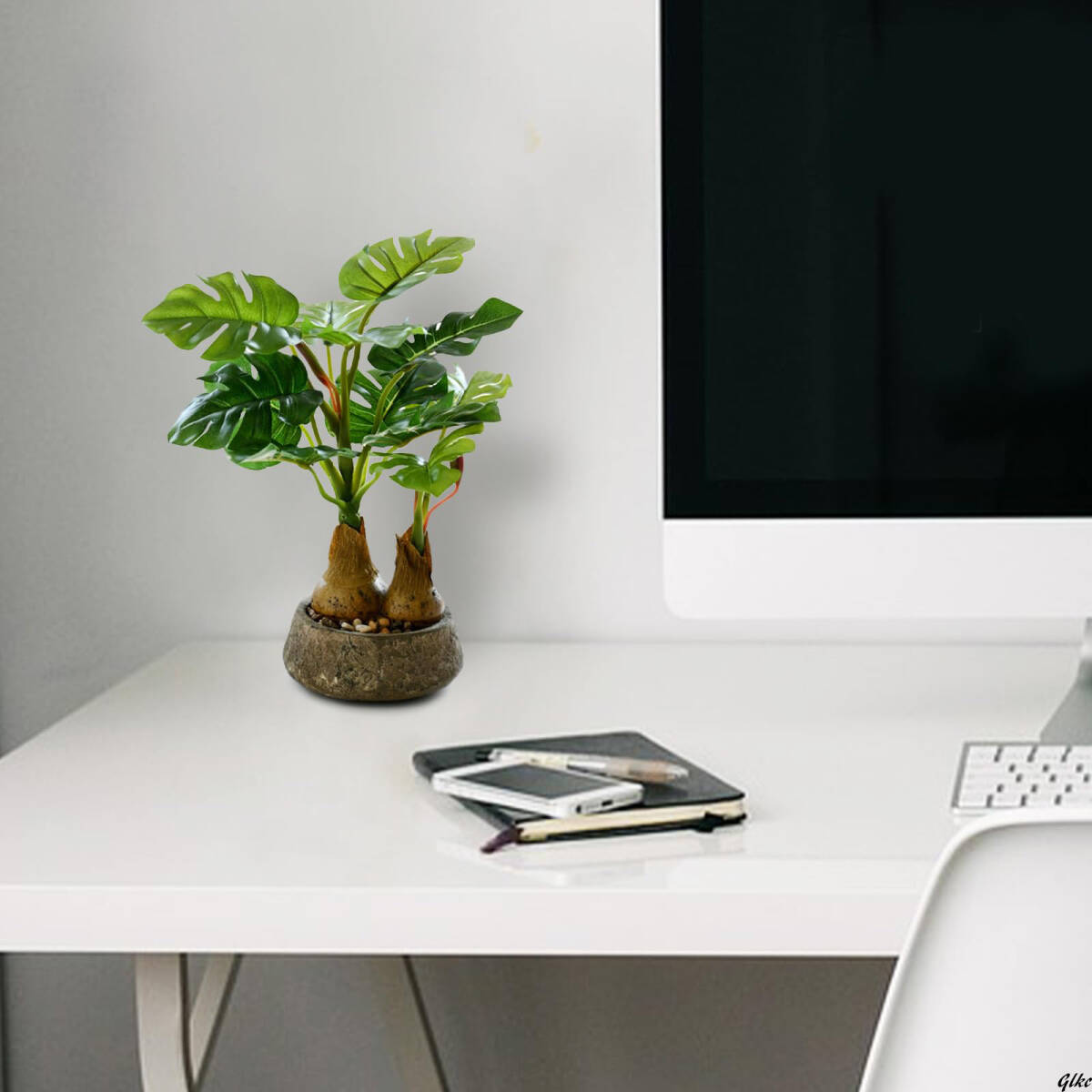 このフェイクグリーンは、人工盆栽として人気のモンステラを使用し、室内や屋外のインテリアにぴったりなデザインです。