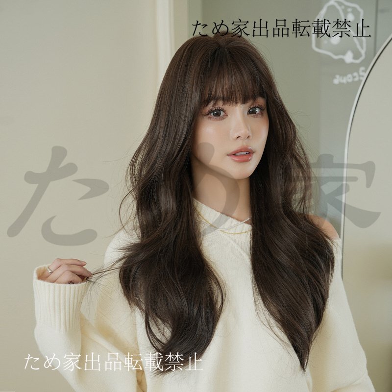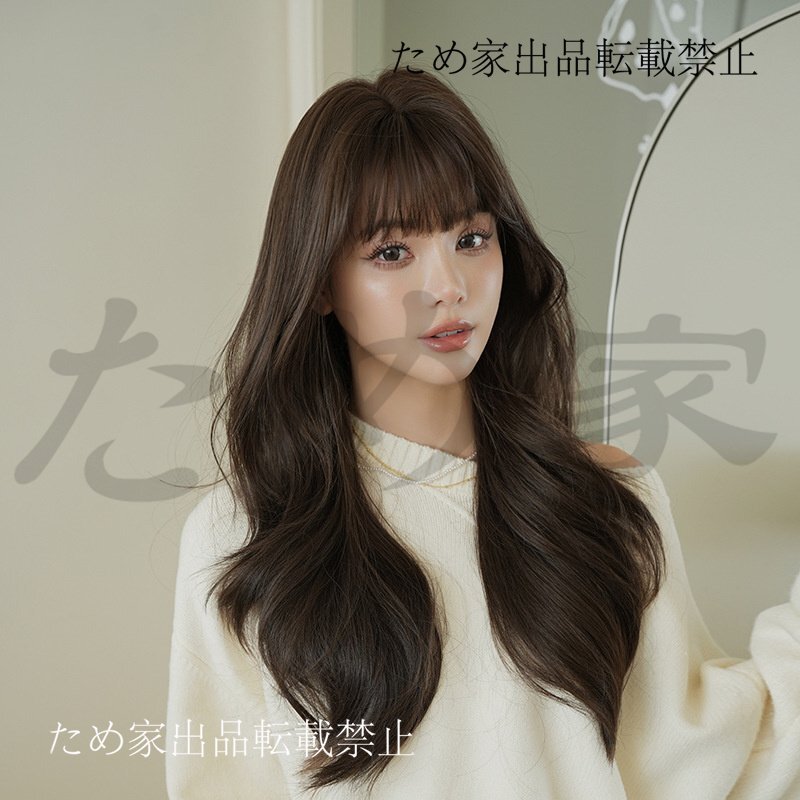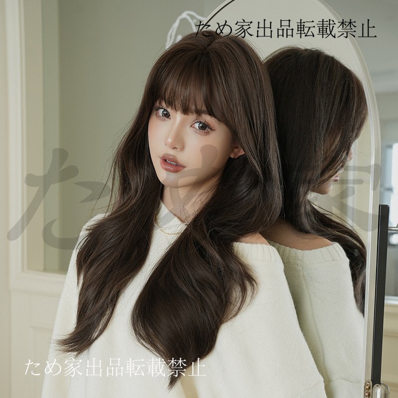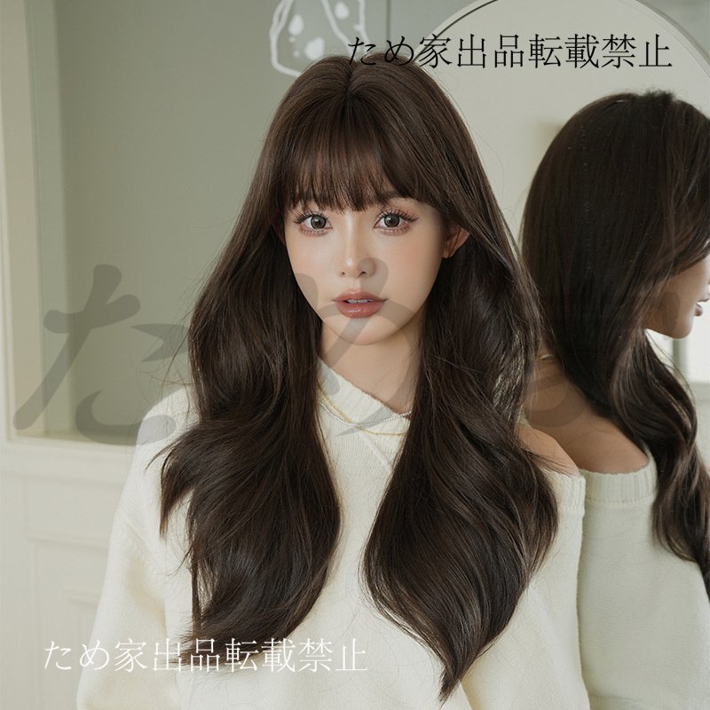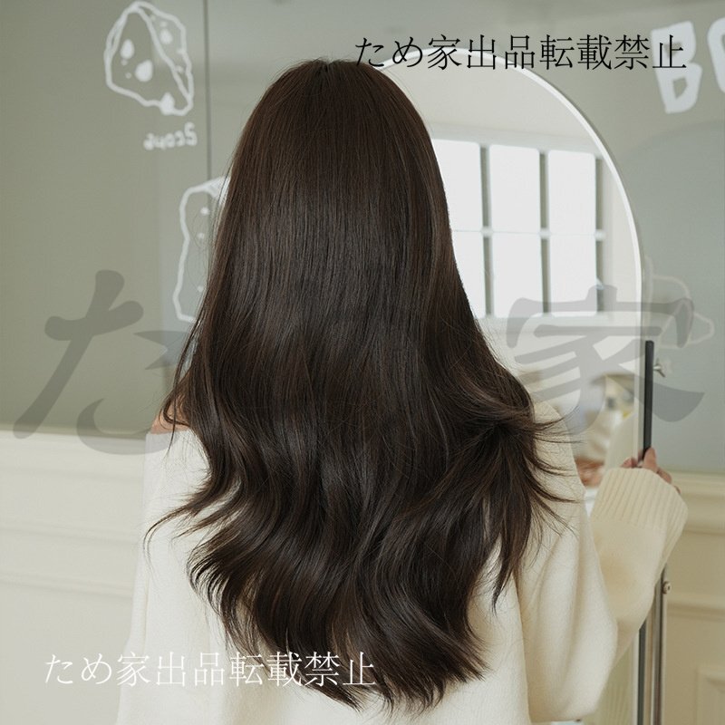 新品人毛 ロングウェーブウィッグ 真っ直ぐ前髪×大きなカール 冷茶ブラウン 上品スタイル つむじ部分手植え 自然に見えますフルウィッグ