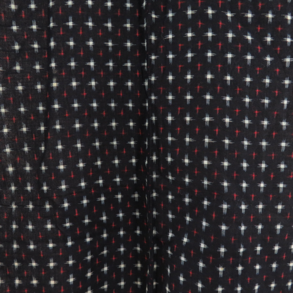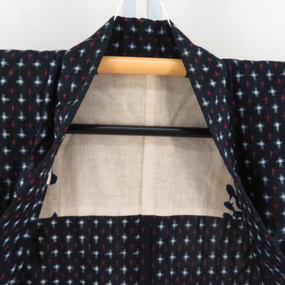 | 木綿着物 アンティーク 木綿 単衣 絣模様 バチ衿 紺色x赤色x白色 仕立て上がり着物 身丈148cm |