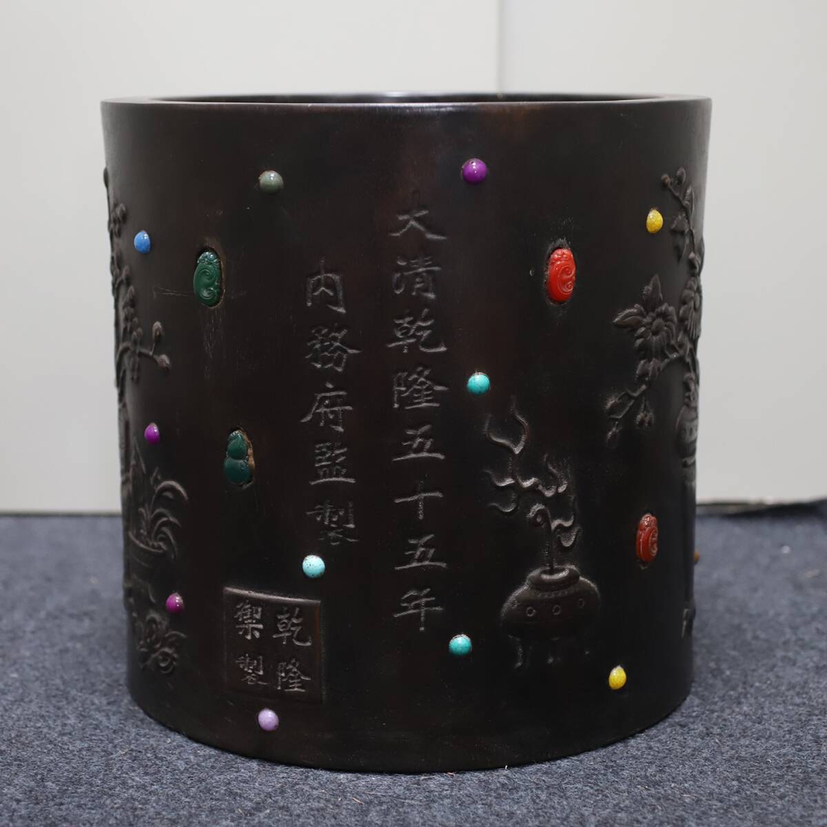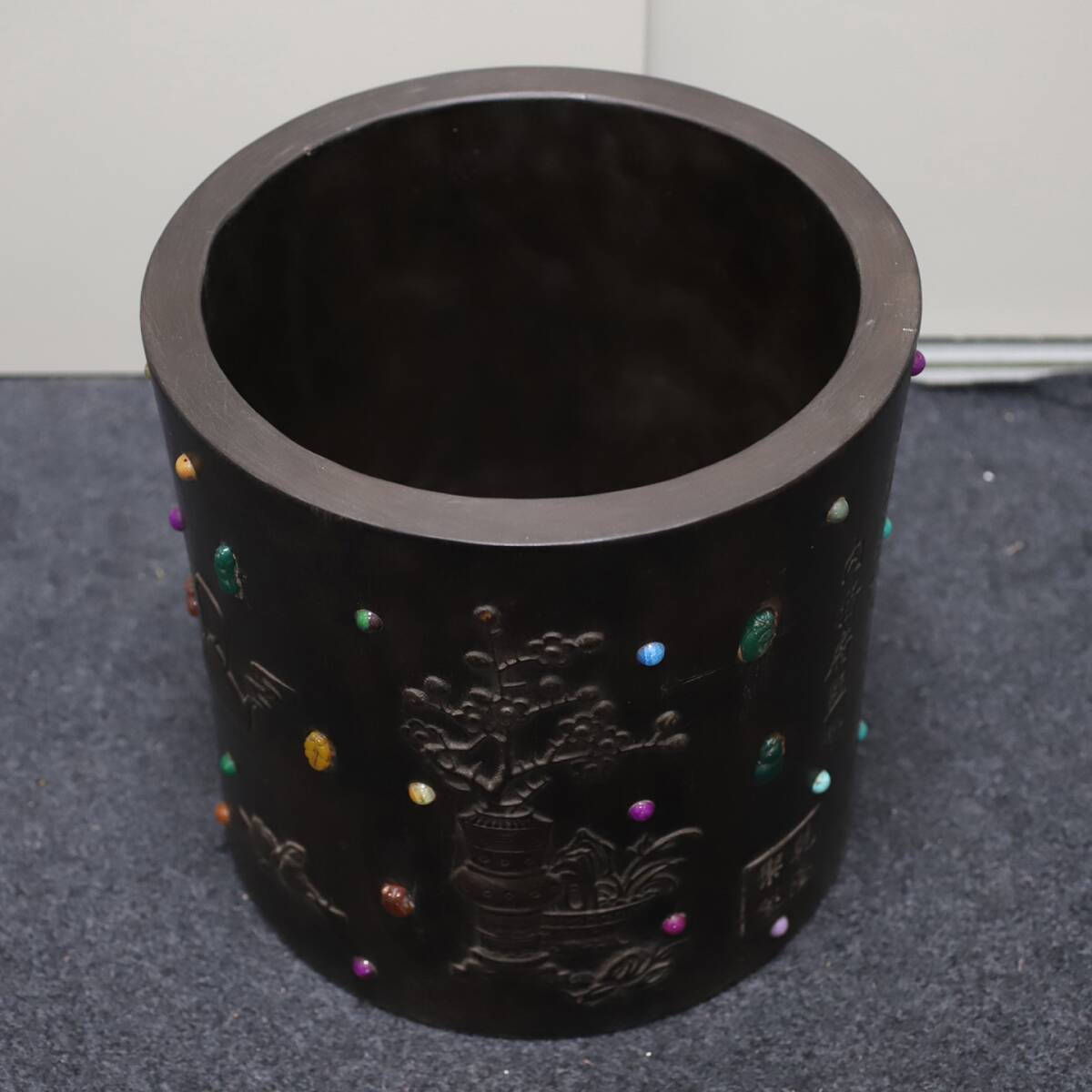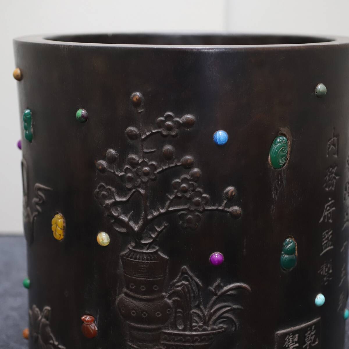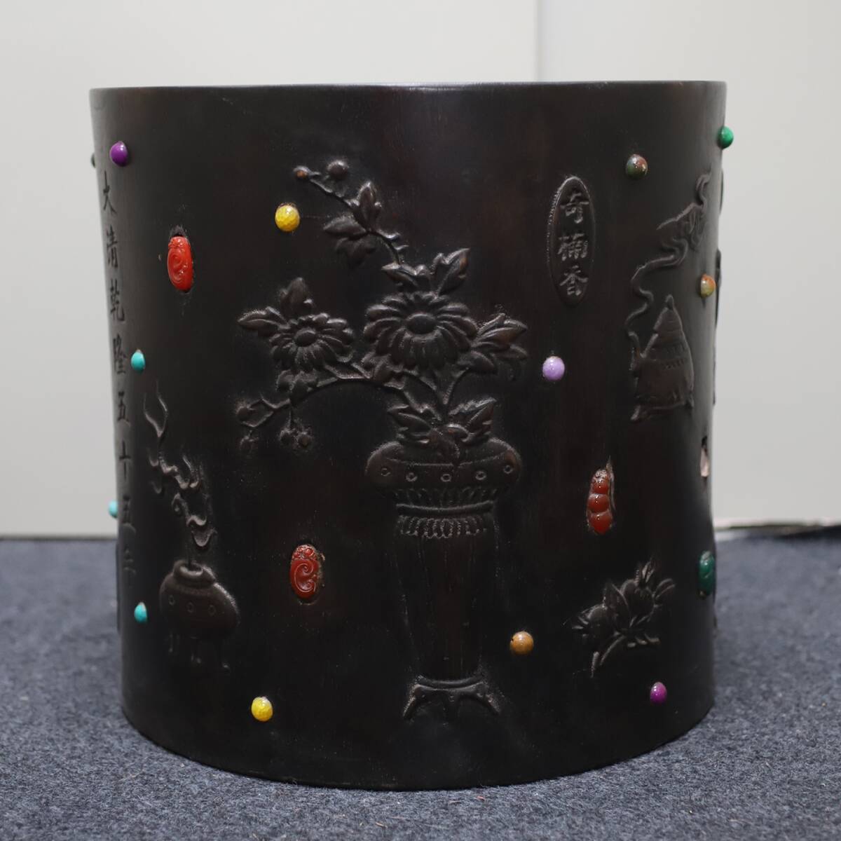 *珍品旧蔵* 清 乾隆年製 沈香木 はめ込む多寶 博古圖 圓筆筒 筆道具 文房具 置物 極細工 唐物 中国古玩 骨董品 古美味 H45