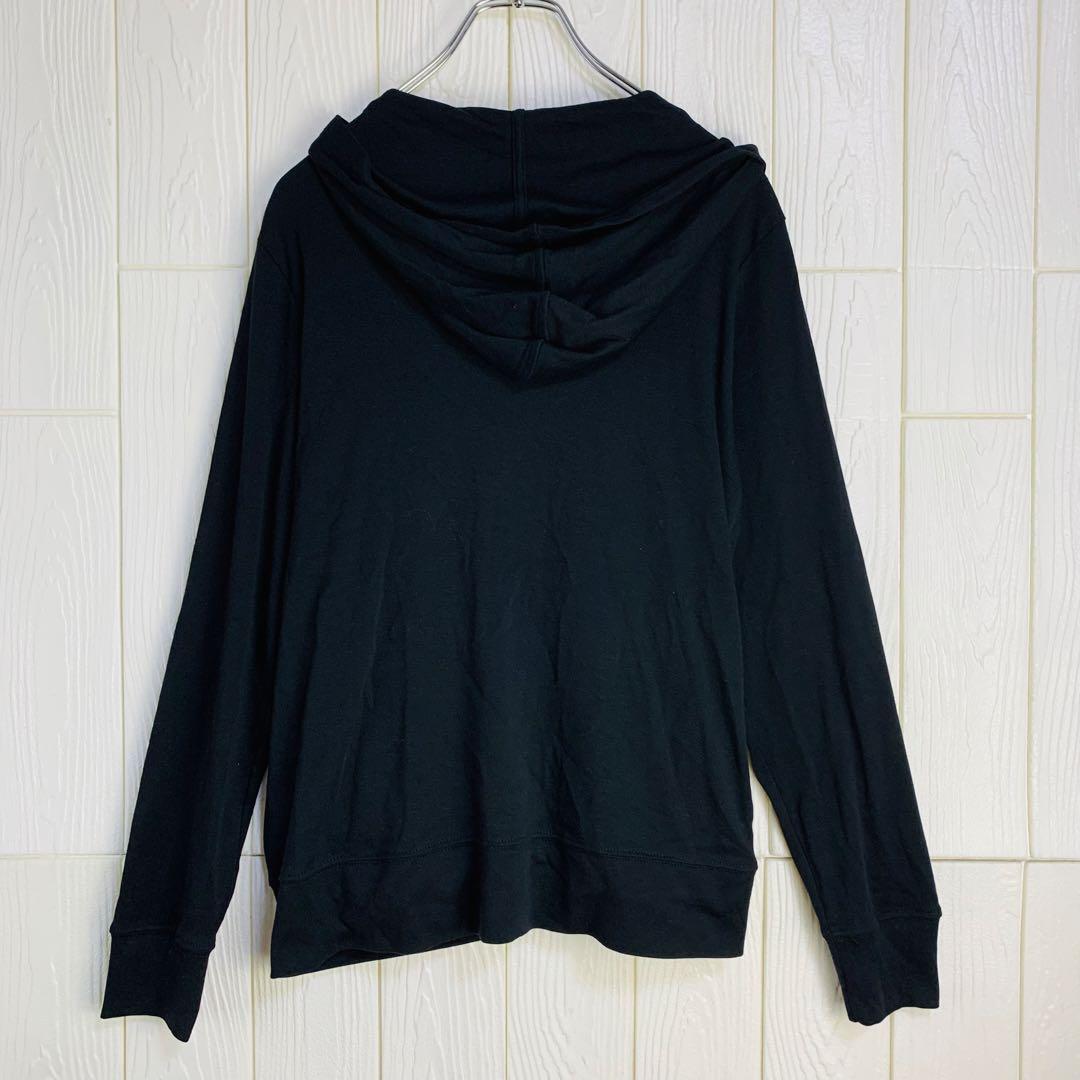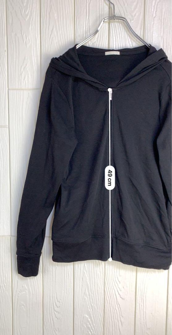 フード付きの黒いジッパー付きパーカー、シンプルで使いやすいデザイン。