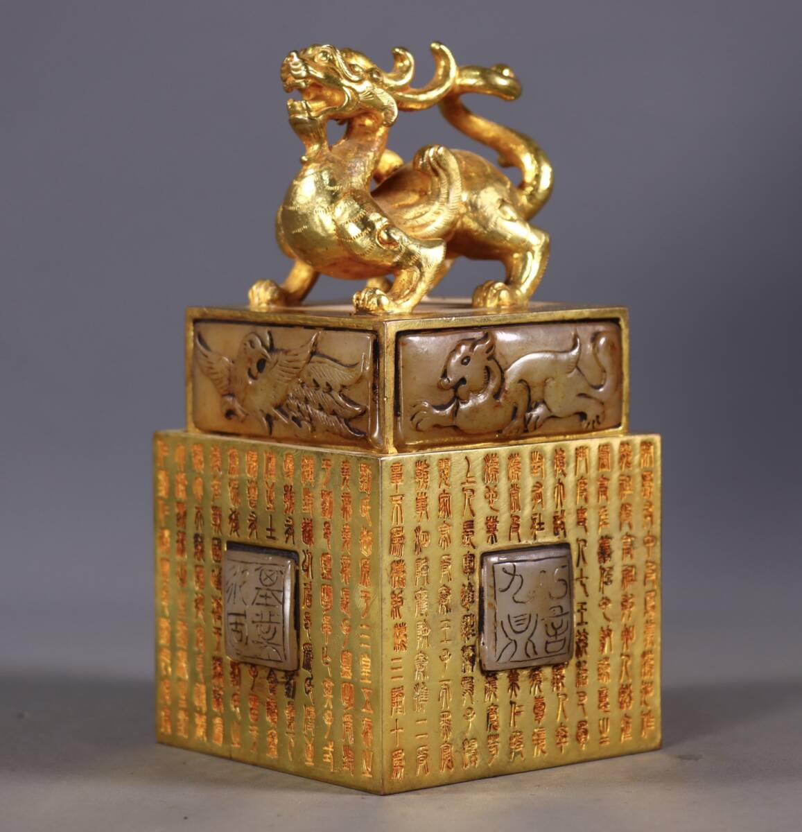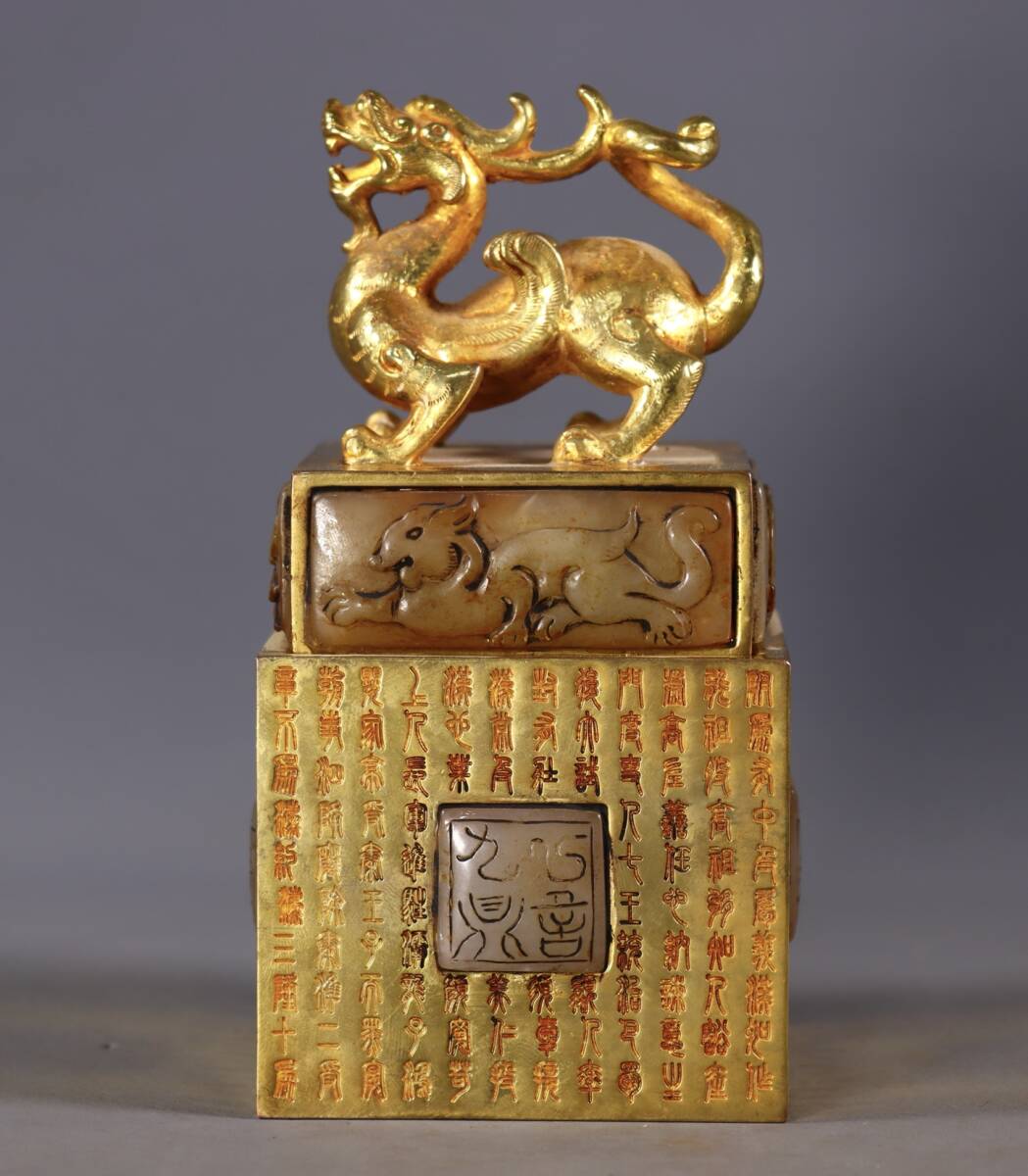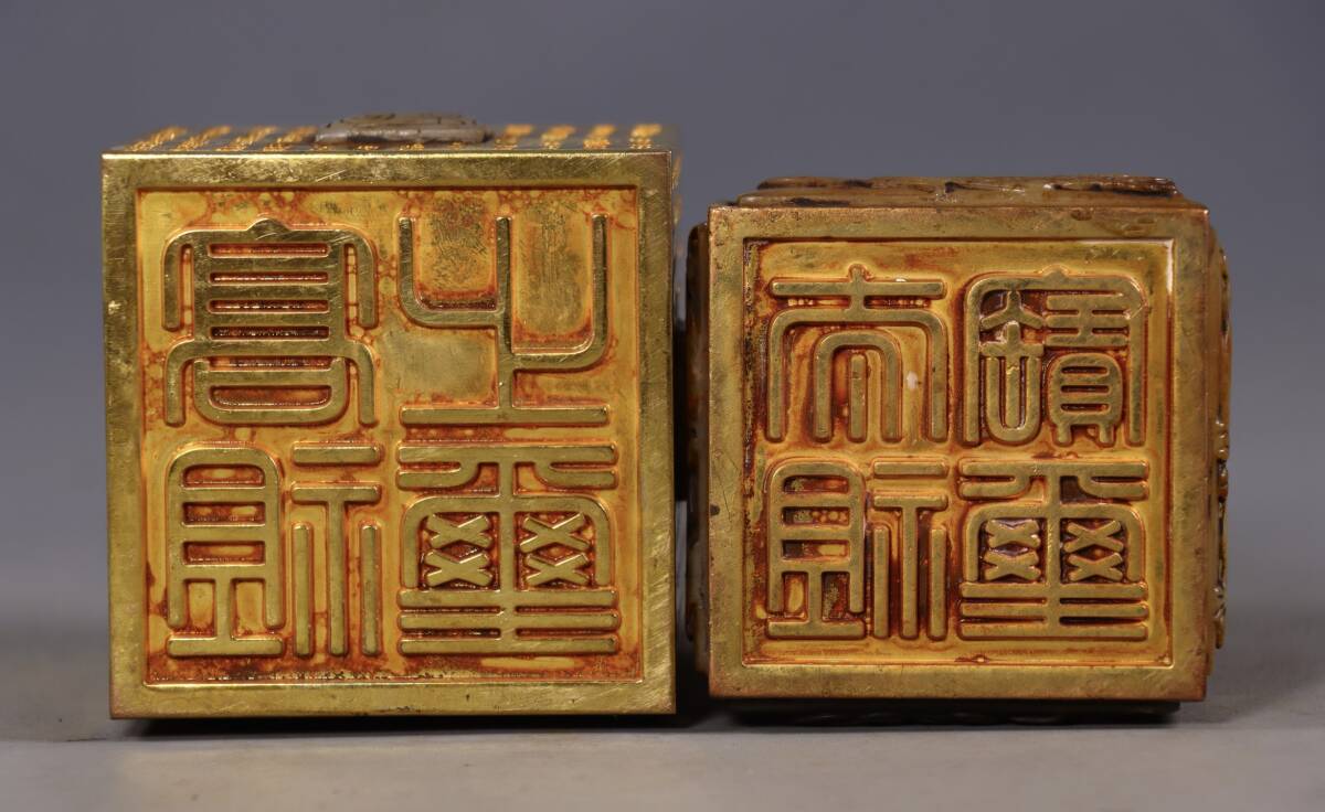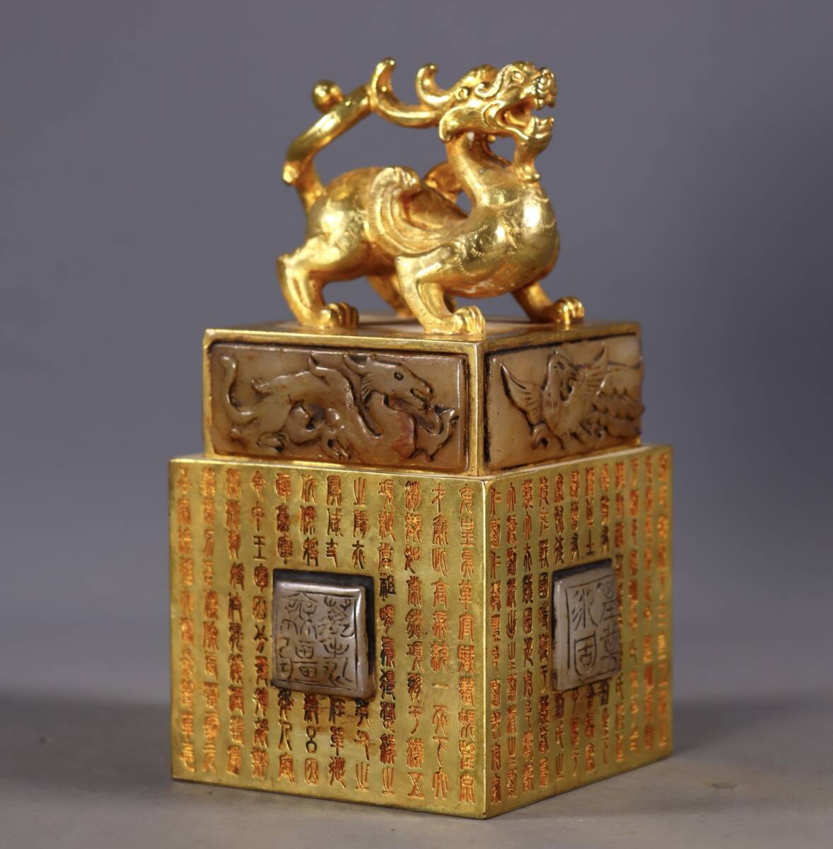 *珍品旧蔵* 清 銅塗金 モザイク和田玉 印章一套 古玉彫 古印材 極細工 唐物 中国古玩 骨董品 古美味 H45