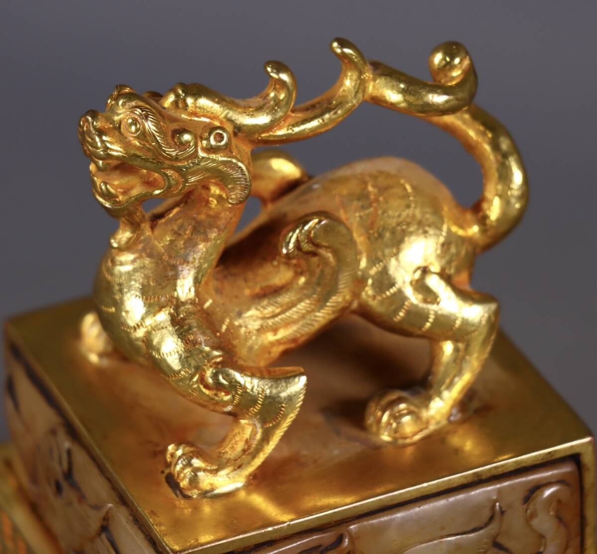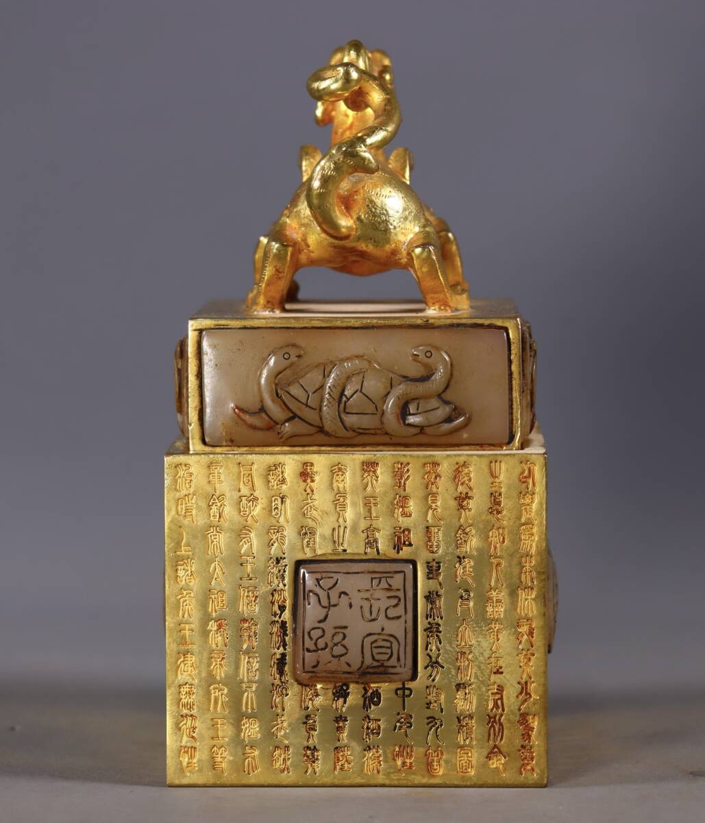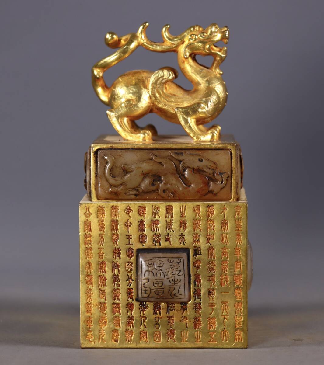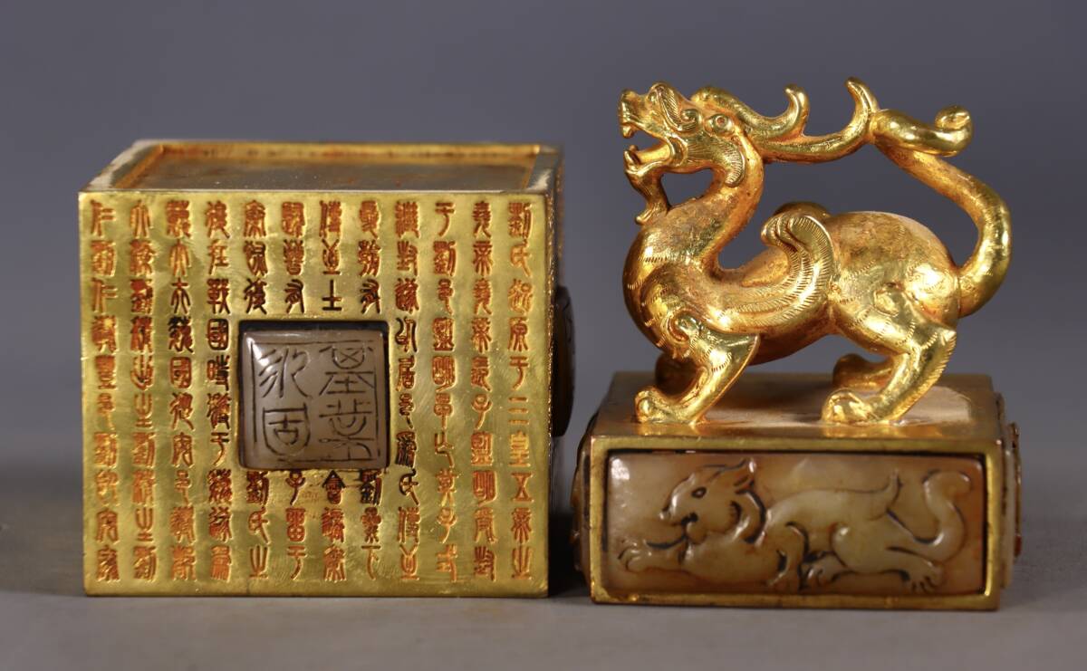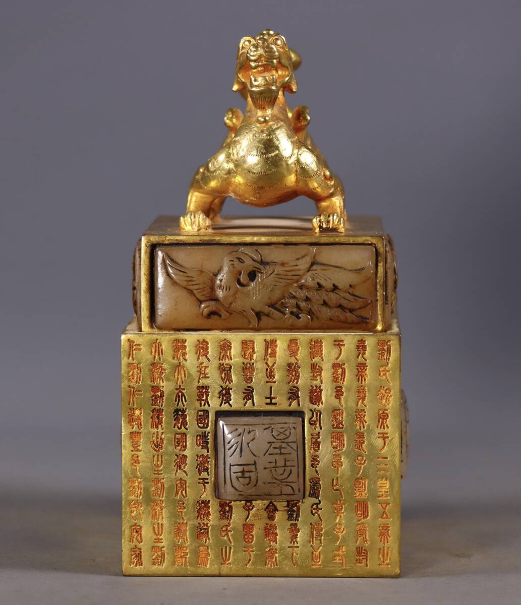 *珍品旧蔵* 清 銅塗金 モザイク和田玉 印章一套 古玉彫 古印材 極細工 唐物 中国古玩 骨董品 古美味 H45