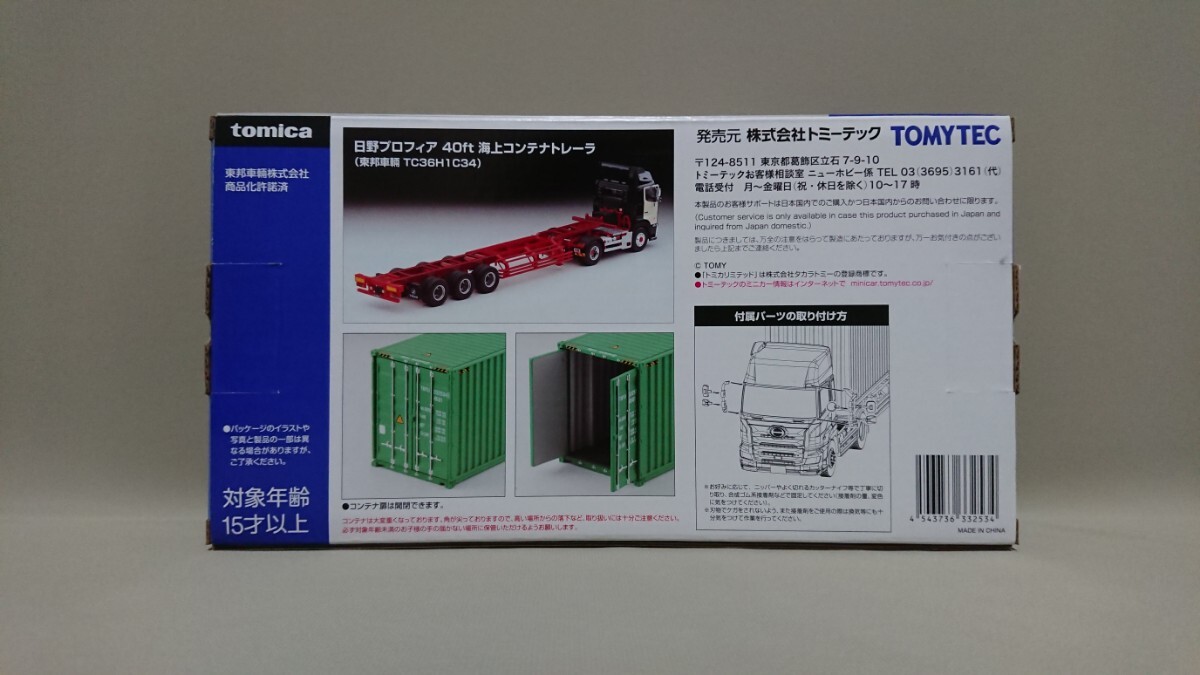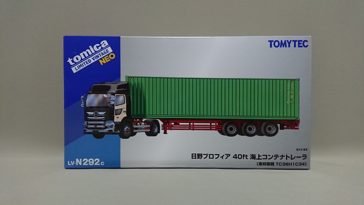 トミカリミテッドヴィンテージ ネオ 1/64 日野 プロフィア 40ft海上コンテナトレーラ 東邦車輌TC36H1C34 黒(LV-N292c)になります。個人所有の為、品質等の保証は出来ません。購入時から箱の一部分に軽い擦れと小さい凹みがありますので、高品質をお求めの方はご遠慮願います。