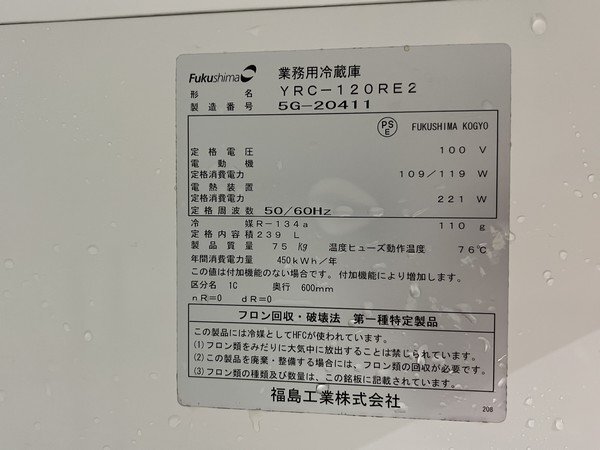 §綺麗【 フクシマ / ガリレイ 業務用冷蔵庫 台下冷蔵庫 YRC-120RE2 テーブル形冷蔵 冷蔵239L 2016年購入 食品保管 店舗機器 100V 】Q05069