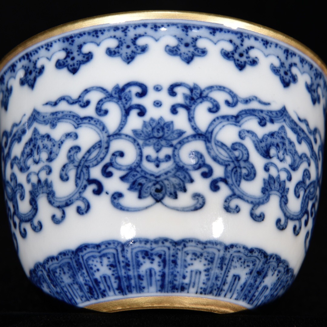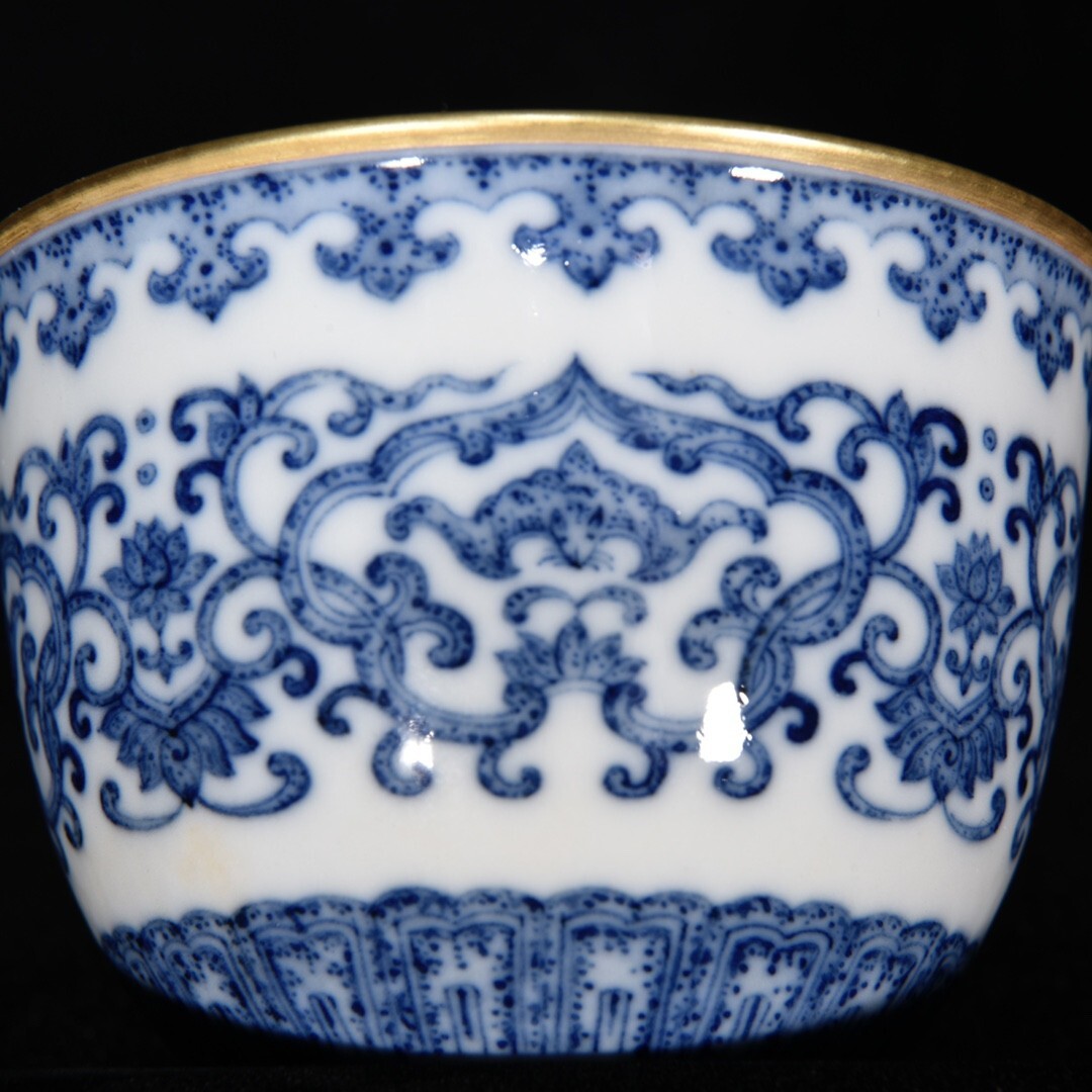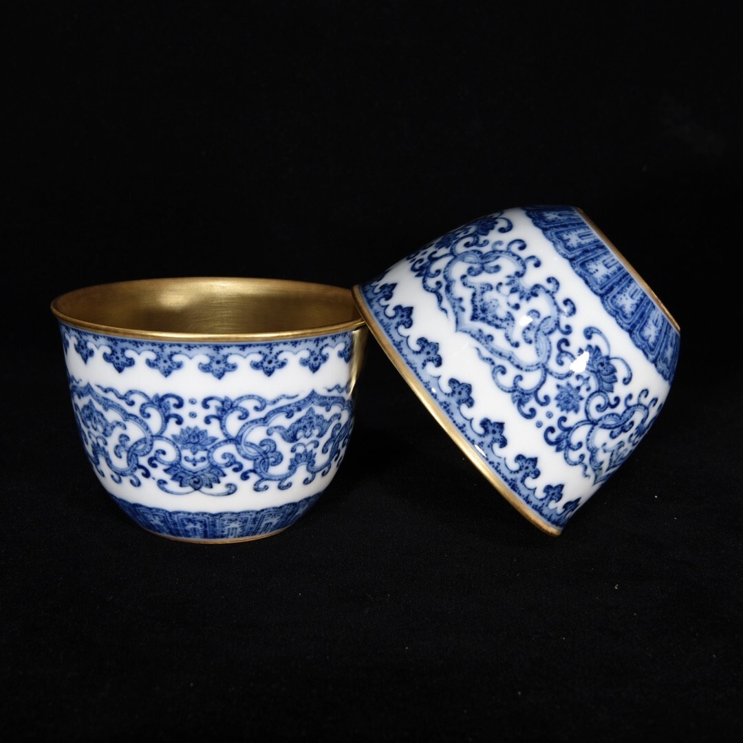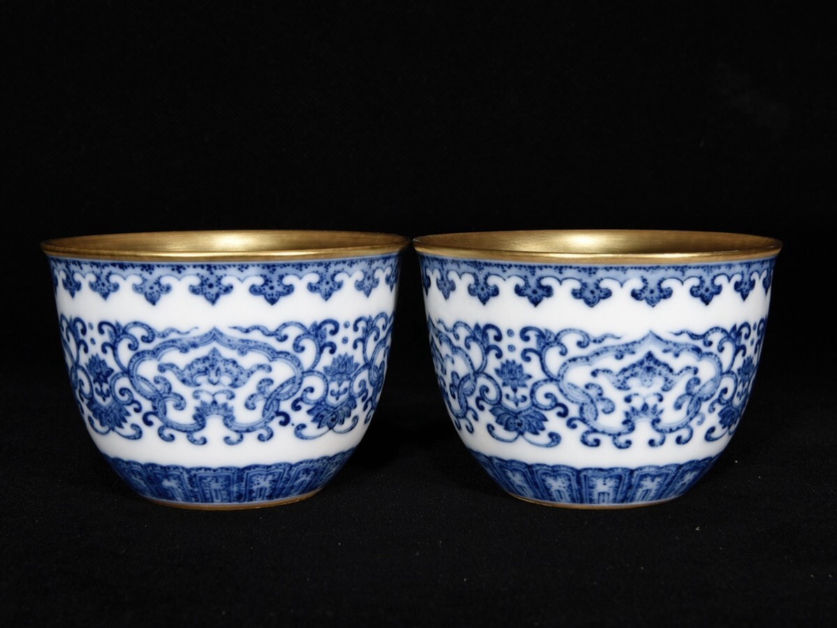 「清 乾隆年製 陶磁器 青花塗金纏枝花卉紋杯一対」染付 置物 擺件 古賞物 中国古美術 旧蔵出