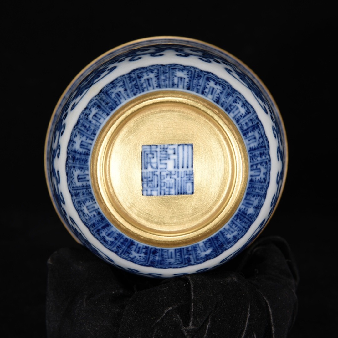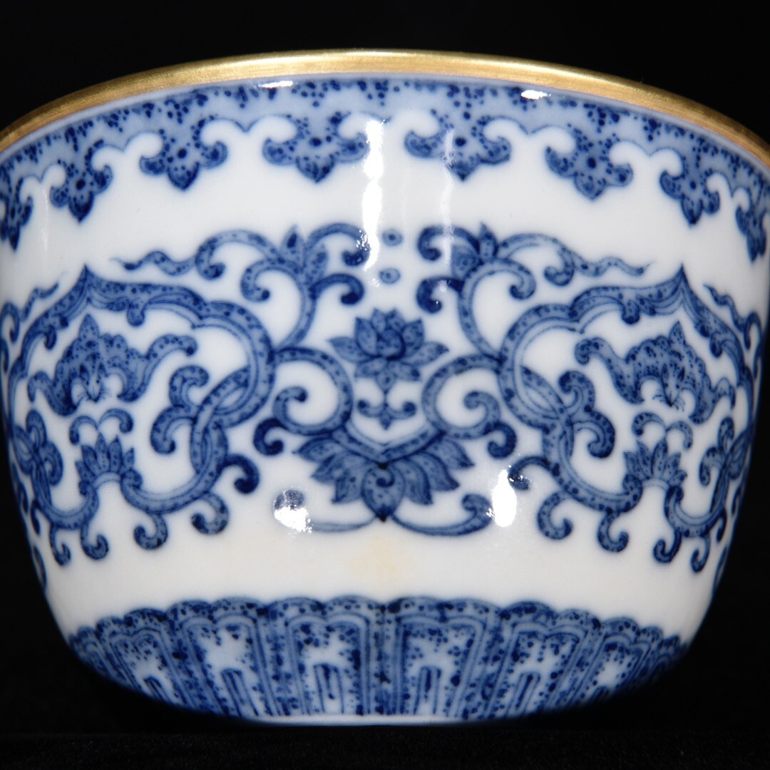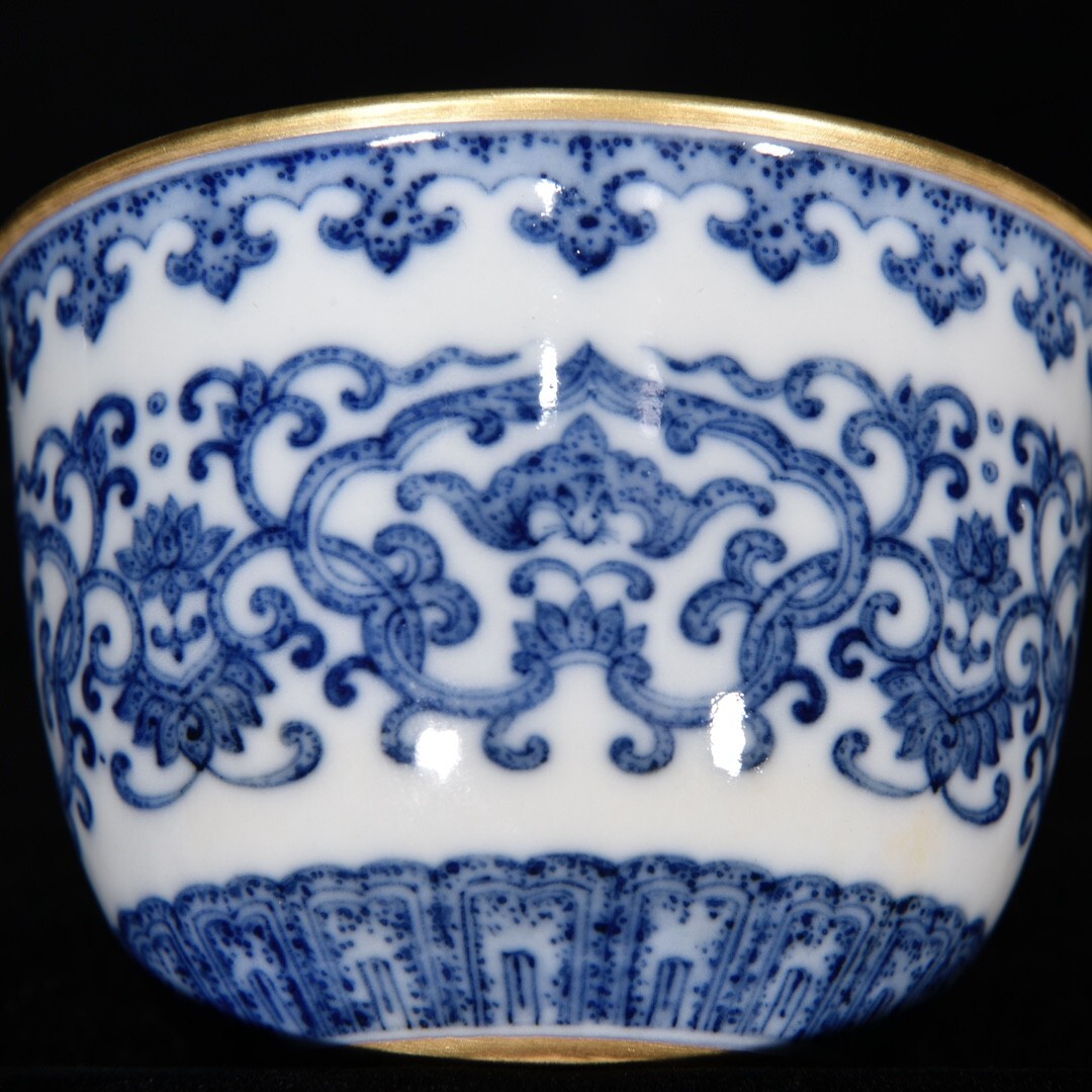 「清 乾隆年製 陶磁器 青花塗金纏枝花卉紋杯一対」染付 置物 擺件 古賞物 中国古美術 旧蔵出