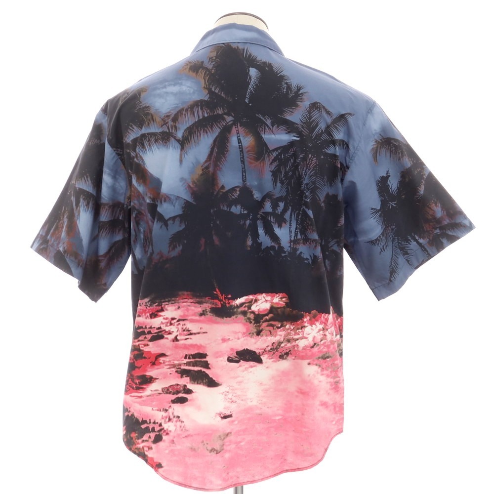 ドライタッチなコットン生地を使用した、オープンカラー半袖シャツです。夕暮れのパームツリーとピンクに染まった海辺の風景が、まるで1枚のアートのように美しく描かれています。胸元にはブランドロゴをさりげなく配置し、上品なアクセントに。軽やかな着心地で春夏シーズンにぴったりの一着です。リゾートスタイルはもちろん、タウンユースにも映える華やかな一枚です。
