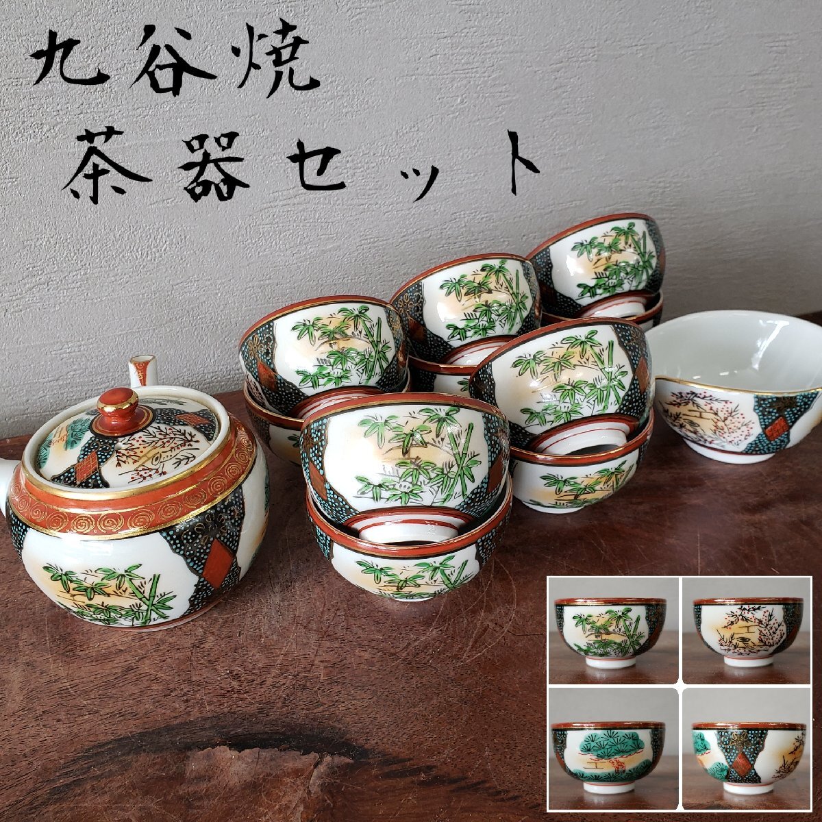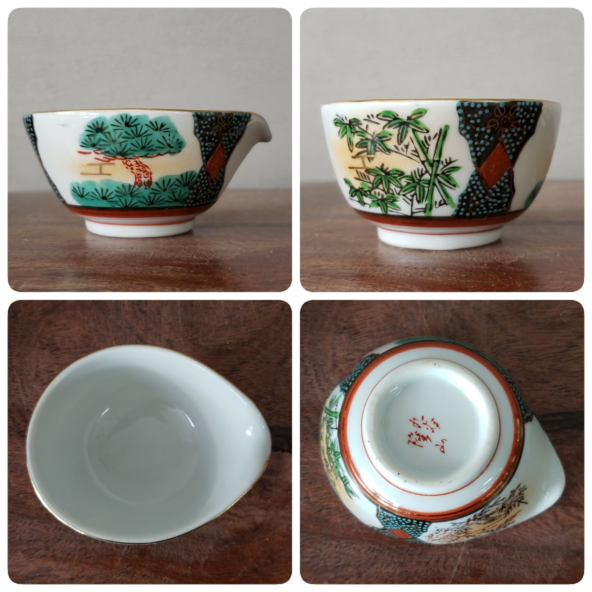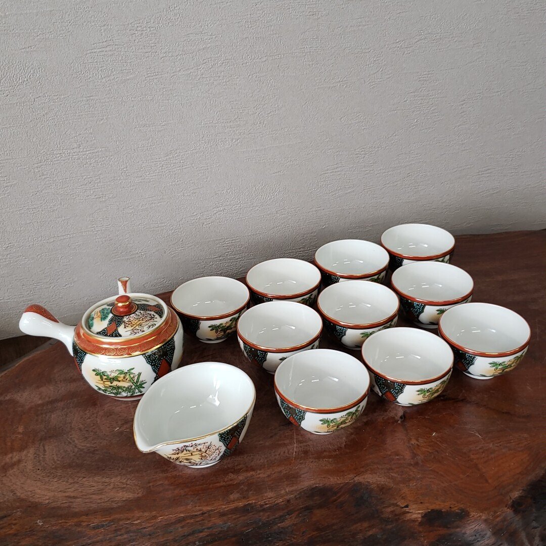 松竹梅の絵柄が素敵な九谷焼の茶器セットです。外箱はありません。急須1点、湯冷まし1点、湯呑み10点のセットです。経年による汚れ、擦れ、色素沈着があります。
