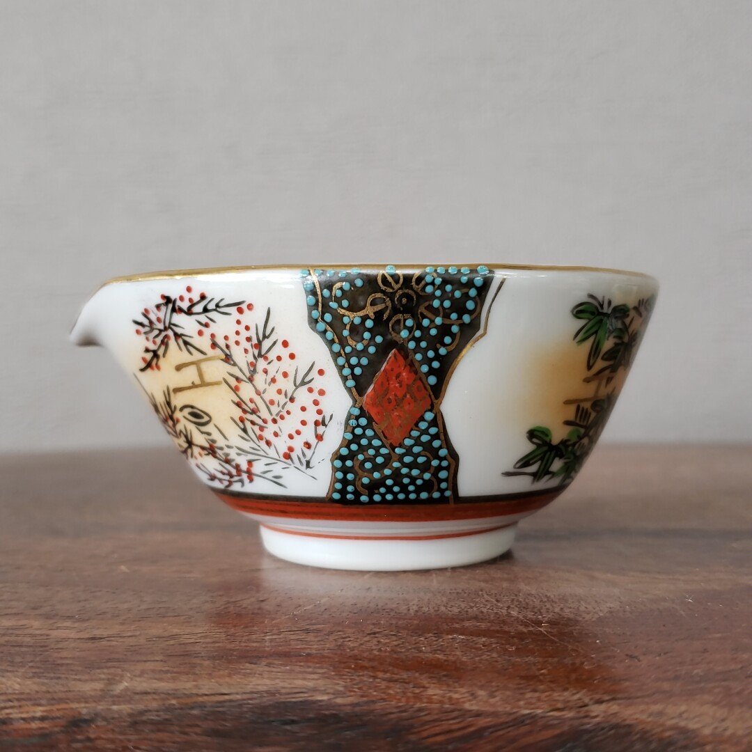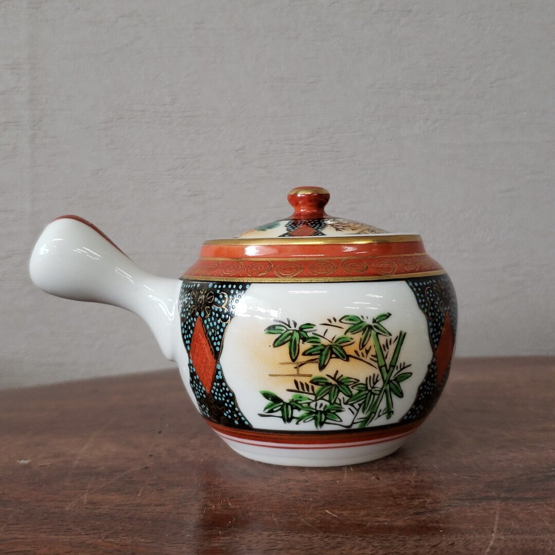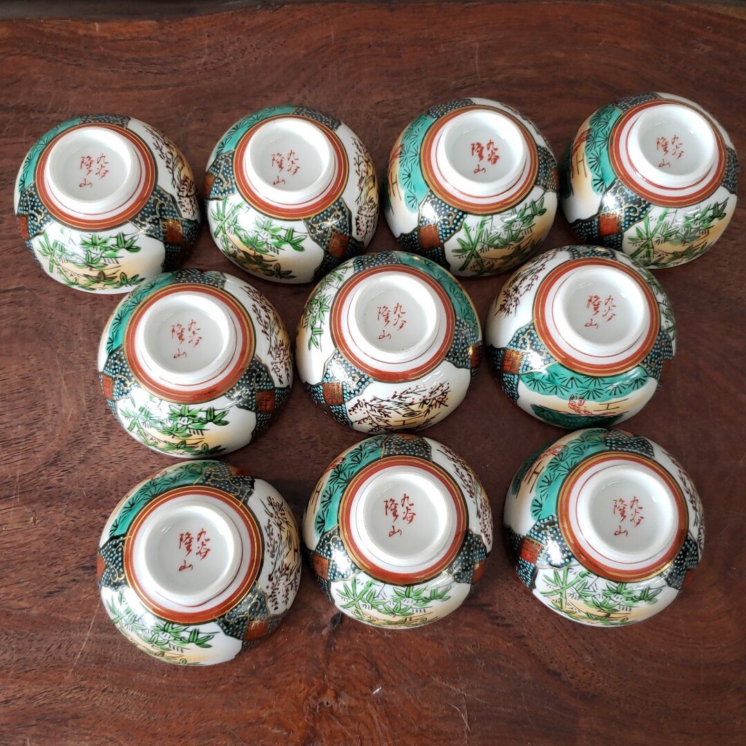 松竹梅の絵柄が素敵な九谷焼の茶器セットです。外箱はありません。急須1点、湯冷まし1点、湯呑み10点のセットです。経年による汚れ、擦れ、色素沈着があります。