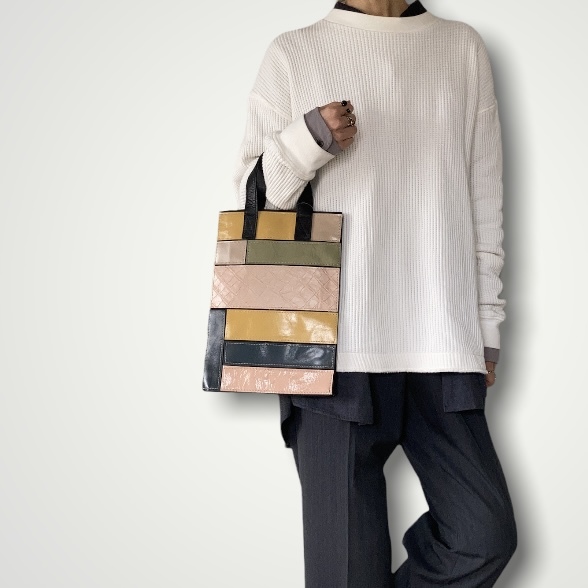 色んな色を組み合わせパズルのように配置した1点物で、前と後ろでもデザインが違うので見せる側によって表情が変わります。