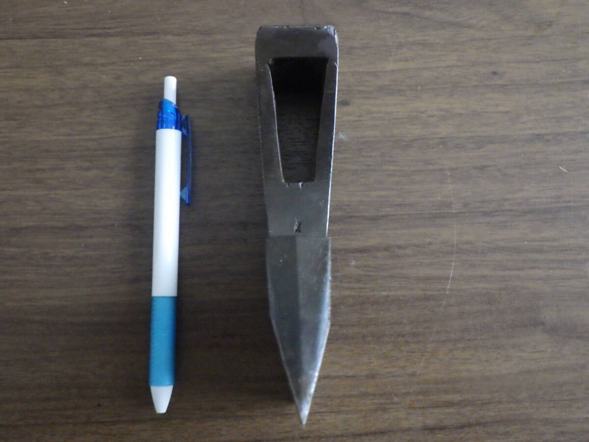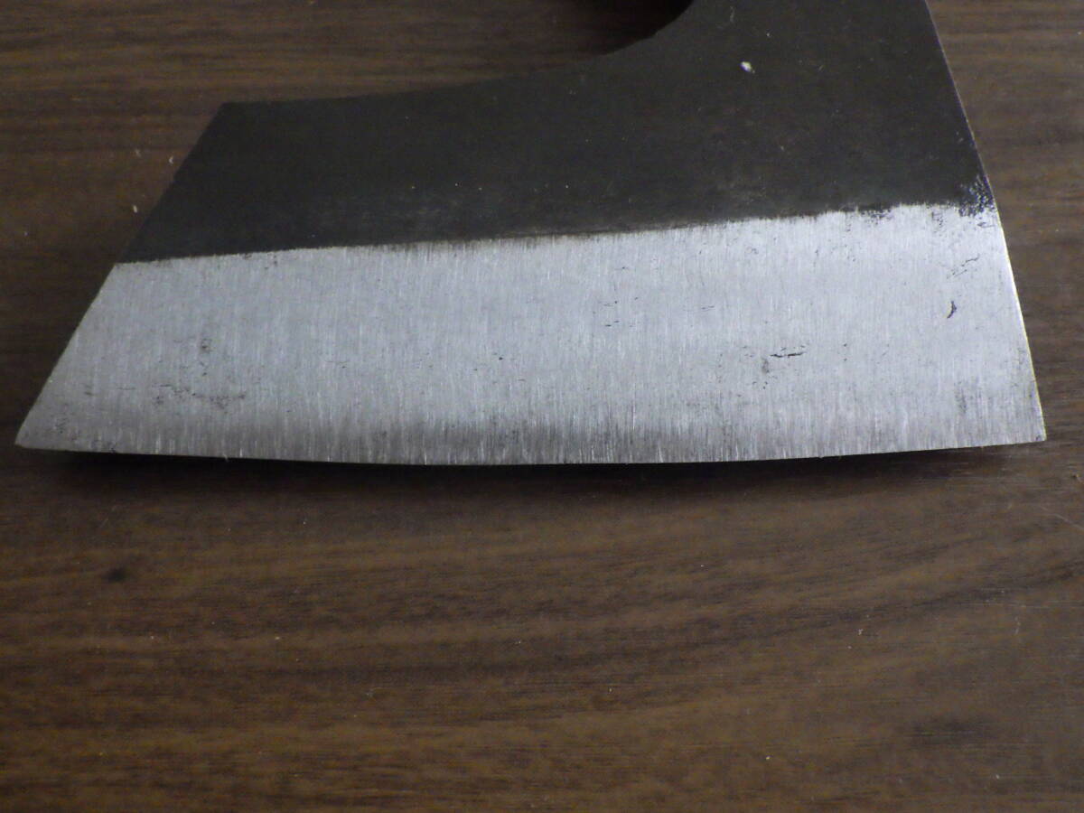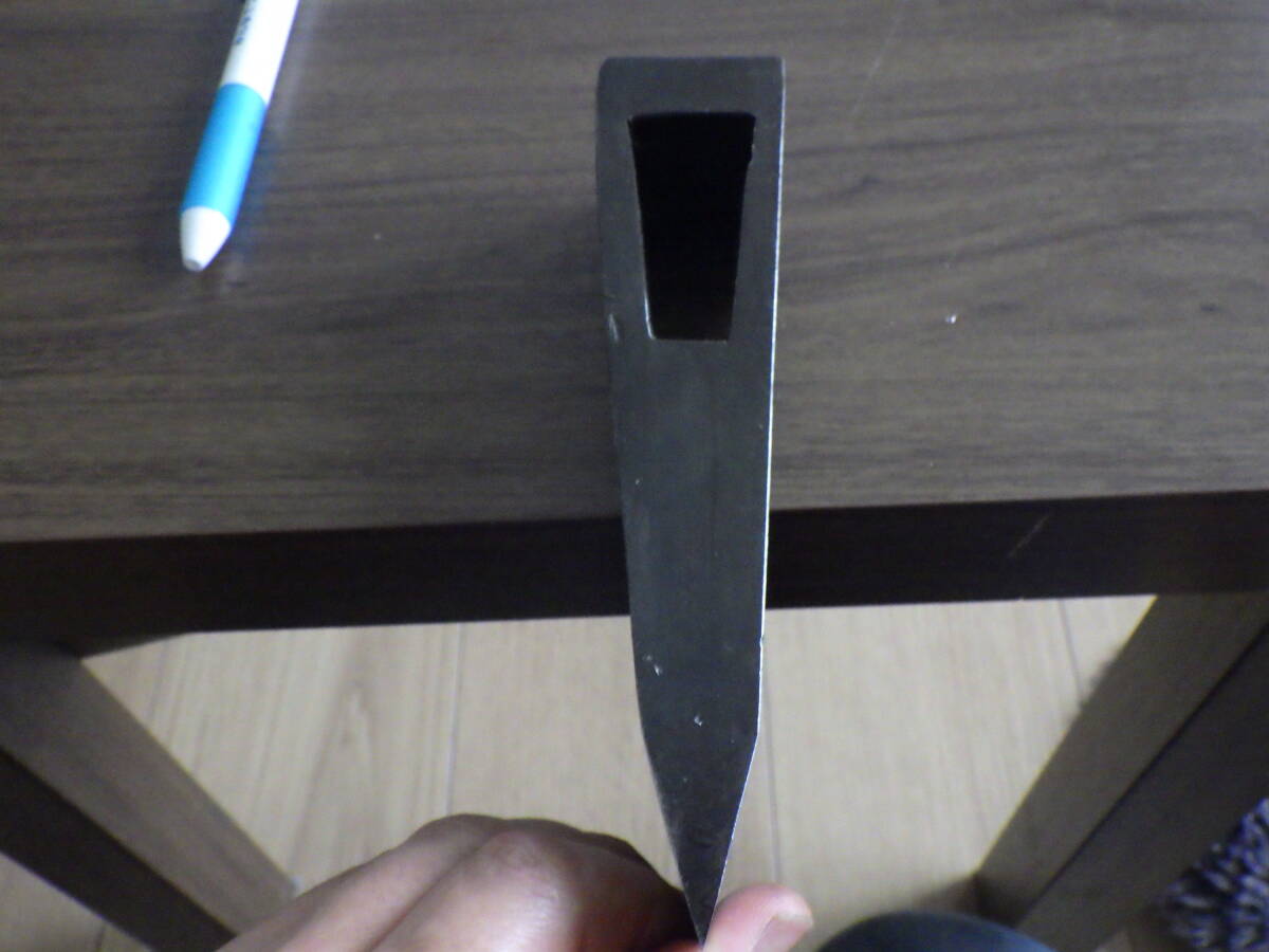 重量は実測1156g(308匁)、頭部幅15.5㎝、刃渡り13.1㎝、櫃穴4.6㎝×1.2㎝(刃側内壁)2.1㎝(峰側内壁)です。