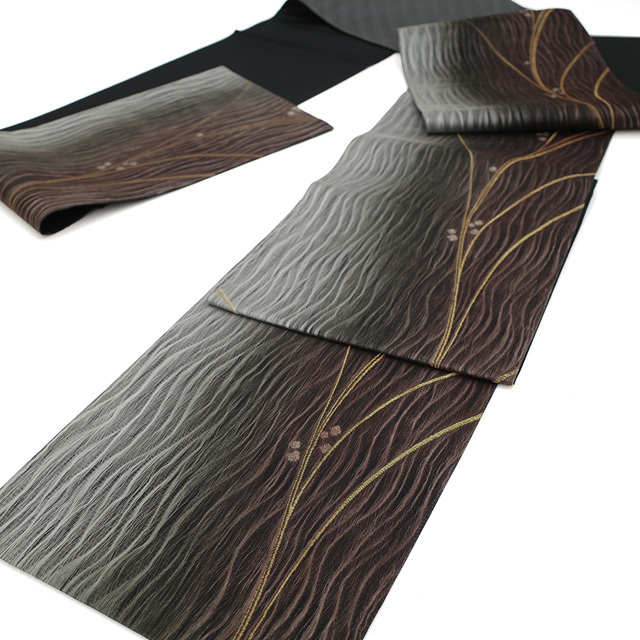 グレー・黒・茶の色糸を巧みに織り重ねた、まるでグラデーションのような奥行きあるすくい織の帯地に、金糸を用いて草花模様を繊細に表現。