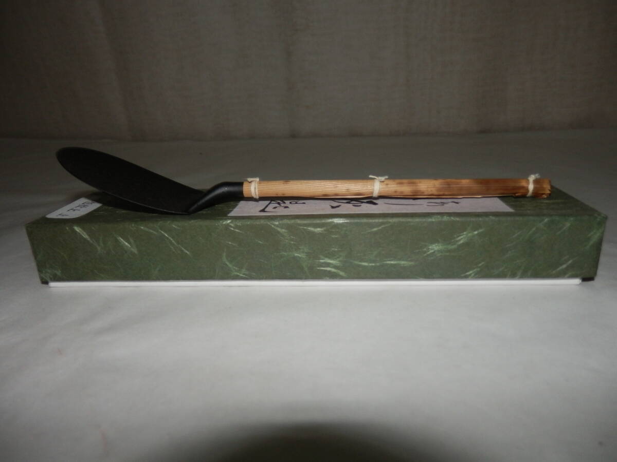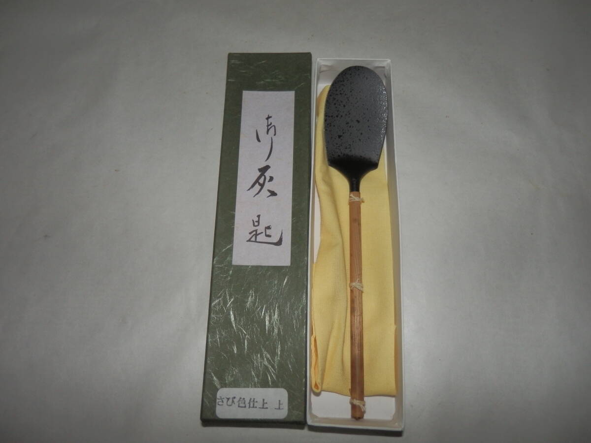 「未使用・茶道具」 灰道具の風炉用の灰匙です。上・さび色仕上です。 長さ約18.8cm。在庫未使用品です。化粧箱。「画像は見本です 未使用の同品を御送りします」 『定形外郵便(全国一律)180円です』どうぞ宜しく。