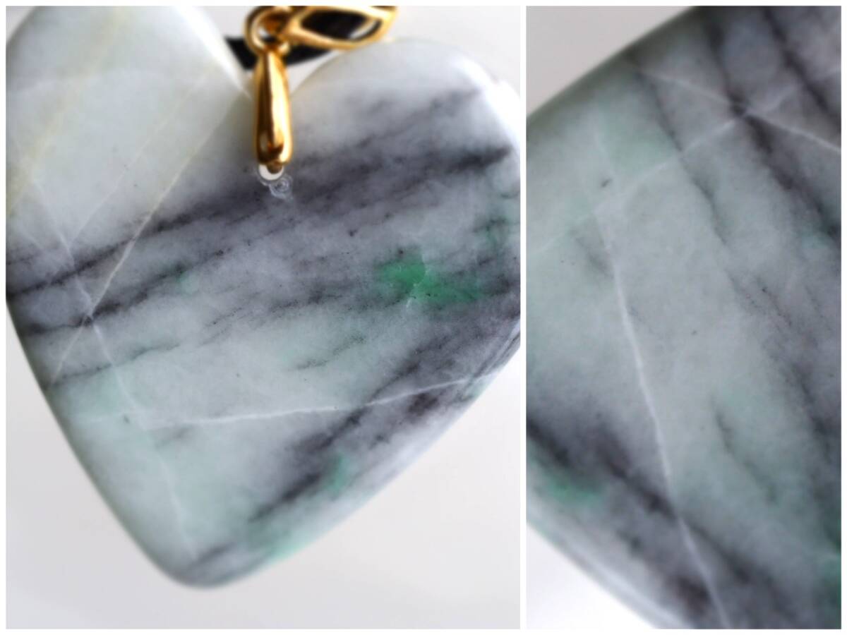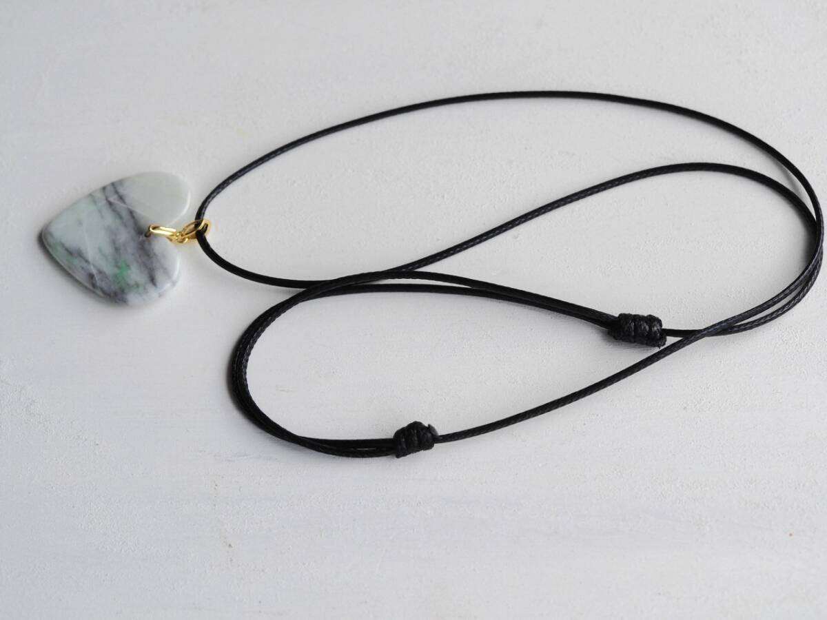 こちらはブラックホワイトグリーンを含んだ糸魚川翡翠にワックスコードに仕上げております。