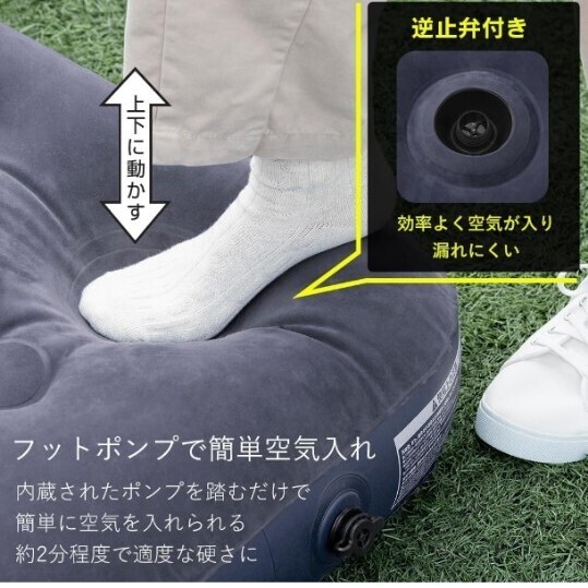 ポンプ不要で、マットに内蔵されたポンプを足踏みするだけで簡単に空気が送れます。