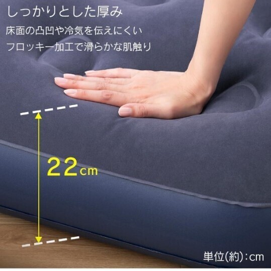しっかり膨らませたときの厚みは「約22cm」となり、なめらかで肌触りがよい表面加工です。