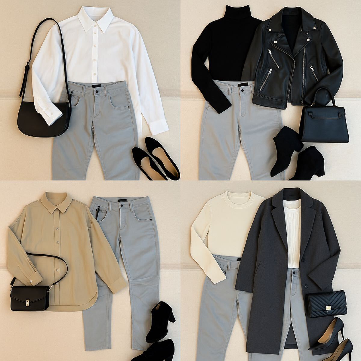 カジュアルからモード系まで幅広く使え、白シャツや黒トップスとの相性も抜群。スニーカーやローファーと合わせて、抜け感のある大人カジュアルが完成します。