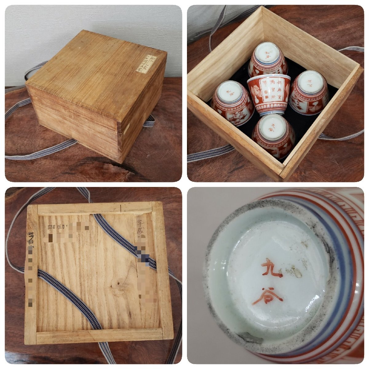 古い九谷焼の湯呑み5客です。繊細な絵柄が素敵です。経年による汚れ、擦れ、細かい絵柄の剥げがあります。木箱付きです。木箱の底面に日付などの書き込みがあります。
