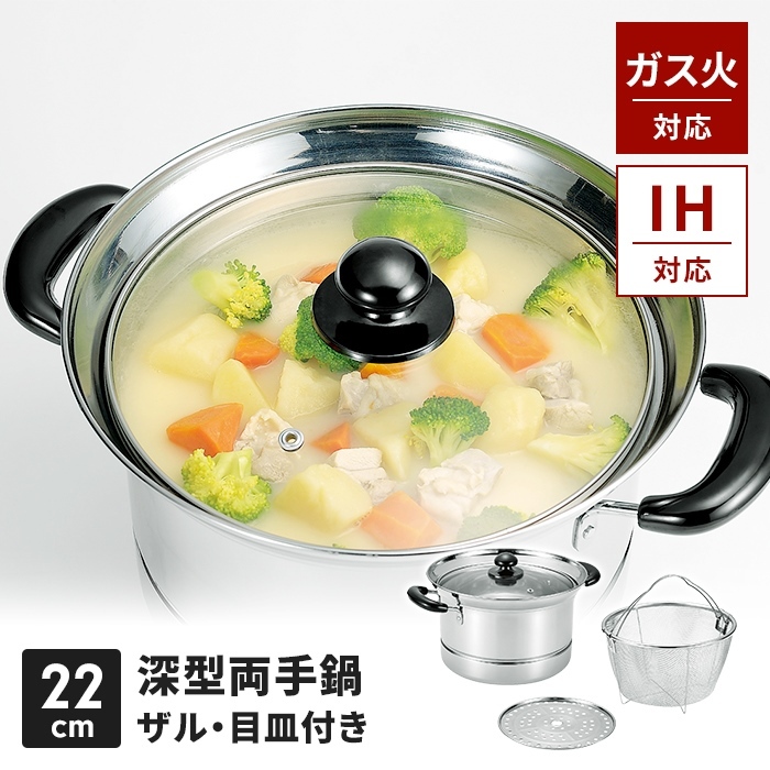 深型両手鍋 22cn ステンレス製 調理鍋 セット品 ガス火 IH オール熱源対応 ガラス蓋付き ザル付き 目皿付き 大容量 便利 ステンレス両手鍋 鍋 深型 4点セット 中が見える 多機能 マルチに使える 蒸し料理 煮込み 下ごしらえ 湯切り お手入れ簡単 衛生的 調理 普段使い キッチン 台所 |