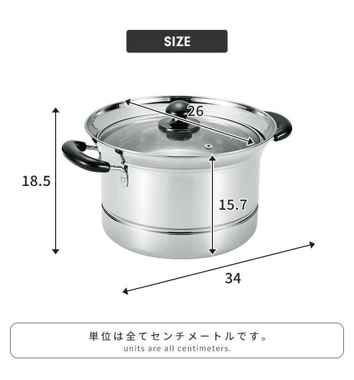 [本体]ステンレス鋼(板厚0.5mm) [ザル]ステンレス鋼 [目皿]ステンレス鋼 [蓋]強化ガラス [ハンドル・ツマミ]フェノール樹脂 |