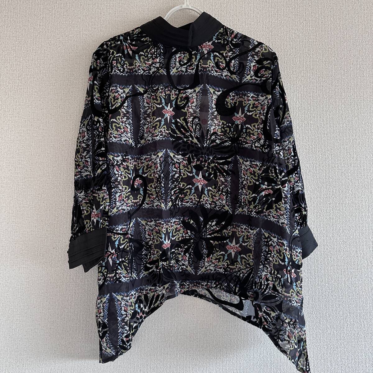 ブラウスは透け感のあるプリントシフォン素材で華やか♪