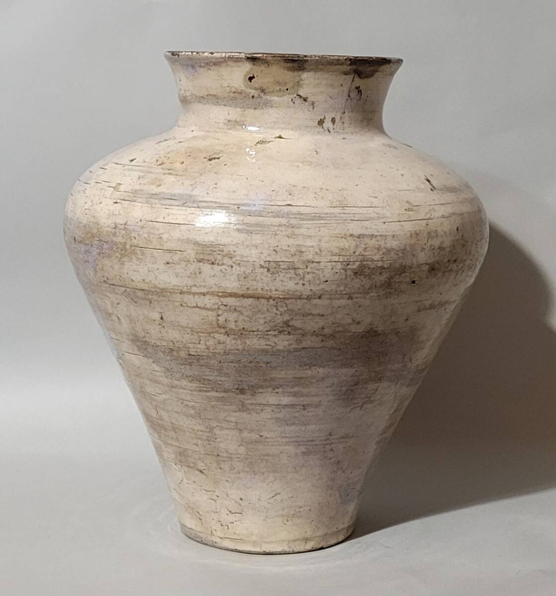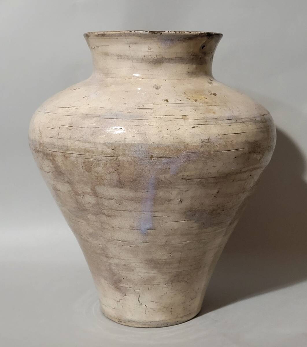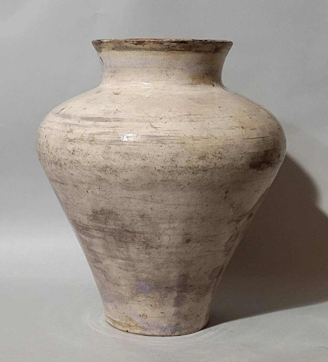 特徴 李朝初期の粉引或いは総刷毛目壺です。総体非常に美しい景色で肩張りの強い器形も素晴らしいです。一部刷毛目の様な景色も楽しめます。内部は細かい磁貫の入る井戸釉で内部も見所となっています。木箱が付属します。