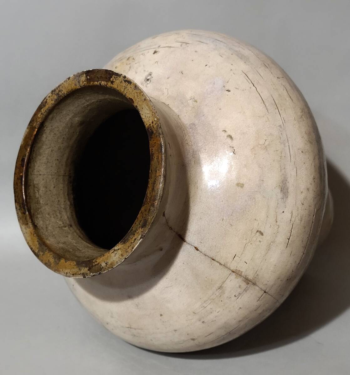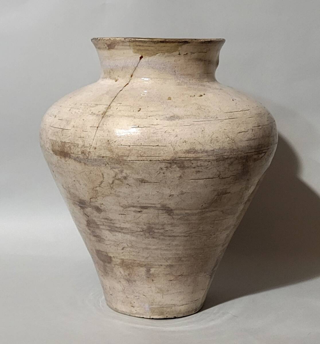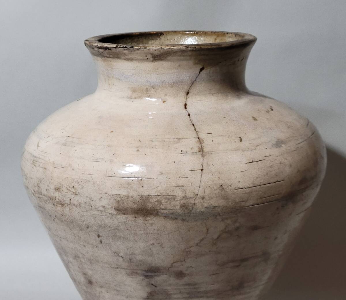 特徴 李朝初期の粉引或いは総刷毛目壺です。総体非常に美しい景色で肩張りの強い器形も素晴らしいです。一部刷毛目の様な景色も楽しめます。内部は細かい磁貫の入る井戸釉で内部も見所となっています。木箱が付属します。