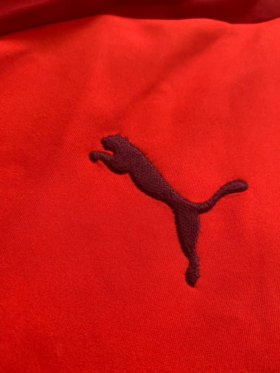 カラーブロッキングのディテール、右胸にPUMAキャットロゴ。