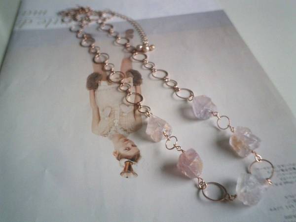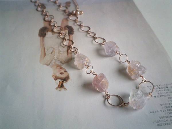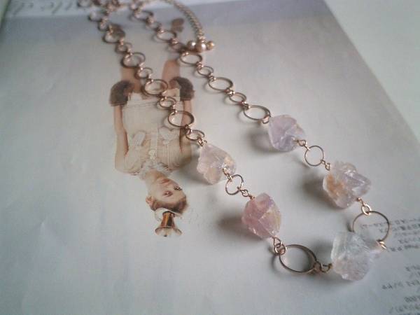 ナチュラル気分・・シリーズです♪繊細な石を集めて・・神秘的なフローライトのネックレスです♪原石そのままの形や色が素敵なラフ・ロックのピンクフローライトは14ミリから17ミリ位の大きさ違いです♪ピンクゴールドのデザインチェーンを合わせて甘すぎない大人のロマンチックしています♪長さは全長73センチ位で調節自由です♪チョーカー風にされても素敵です♪お揃いのブレスレットも出品しています♪♪シンプルで飽きのこないいつまでも着けられるデザインを考えて作りました!ハンドメイドをご理解頂いてノークレーム、ノーリターンでお願いします