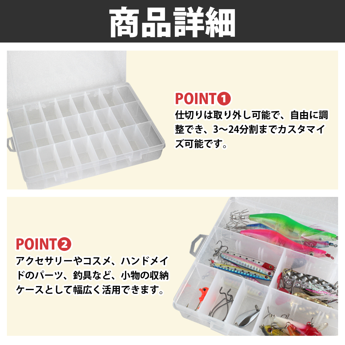 アクセサリーやコスメ、ハンドメイドのパーツ、釣具など、小物収納ケースとして幅広く活用できます。