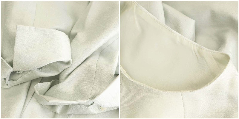 【状態】ジャケットの首周りの茶色の薄汚れと右袖口裏側のホツレ 、ワンピースのブランドタグに濃い茶色の汚れとピンホール、両脇表裏とスリット付近の裏地に茶色の薄汚れがございます。 ※全体的に中古品としての使用感と上記のようなダメージがありますが、通常使用には支障のない商品です。掲載写真や記載内容をご確認いただき、ご理解の上ご購入ください。