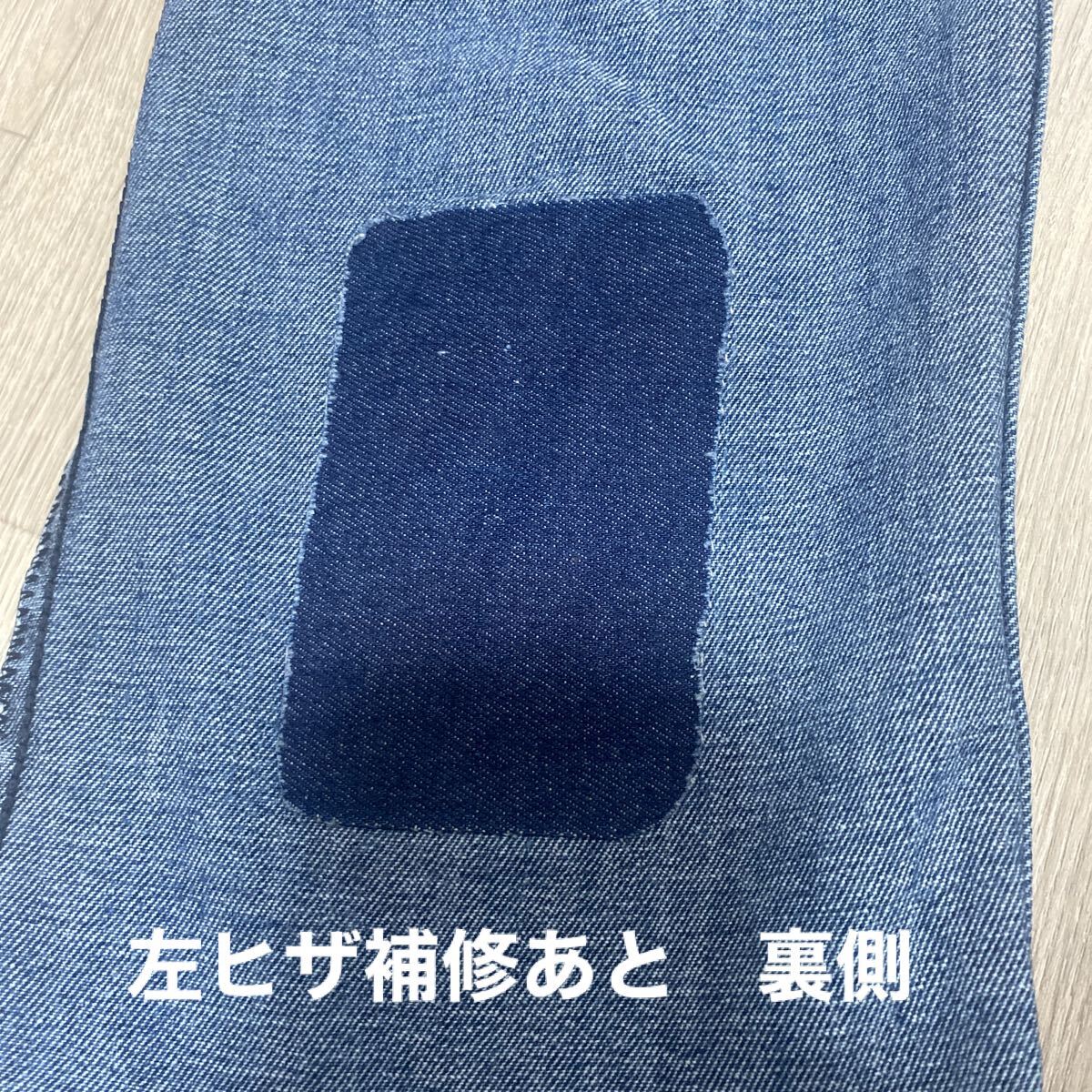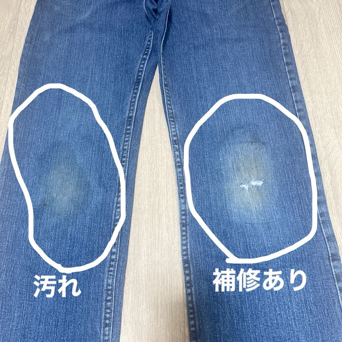 ダメージは、両ヒザに汚れ、左ヒザに破れと補修跡があります。(画像)