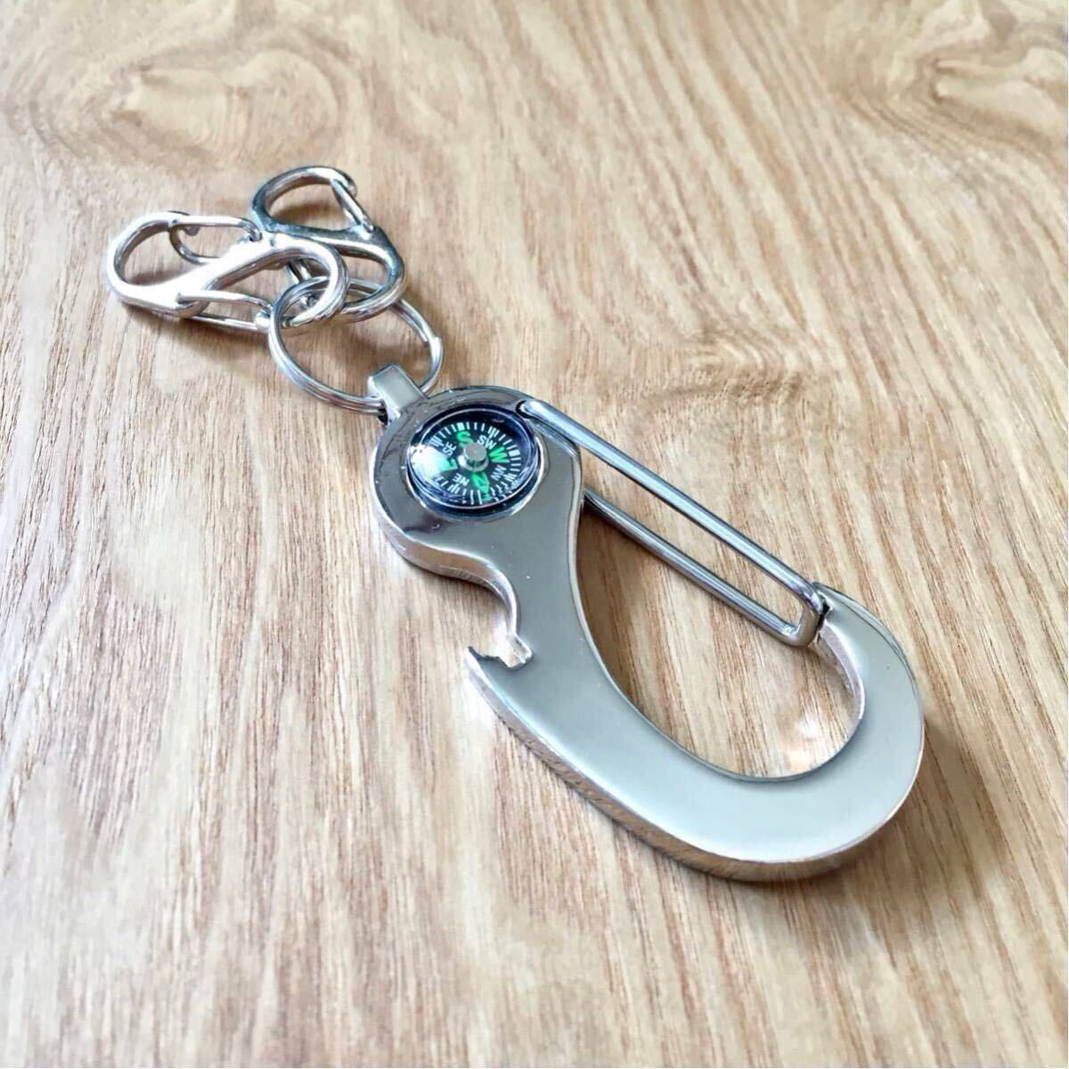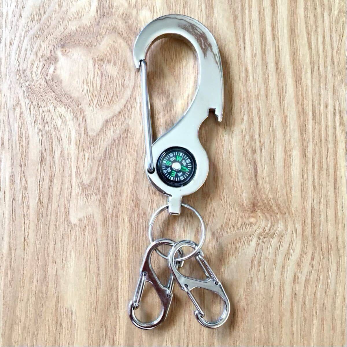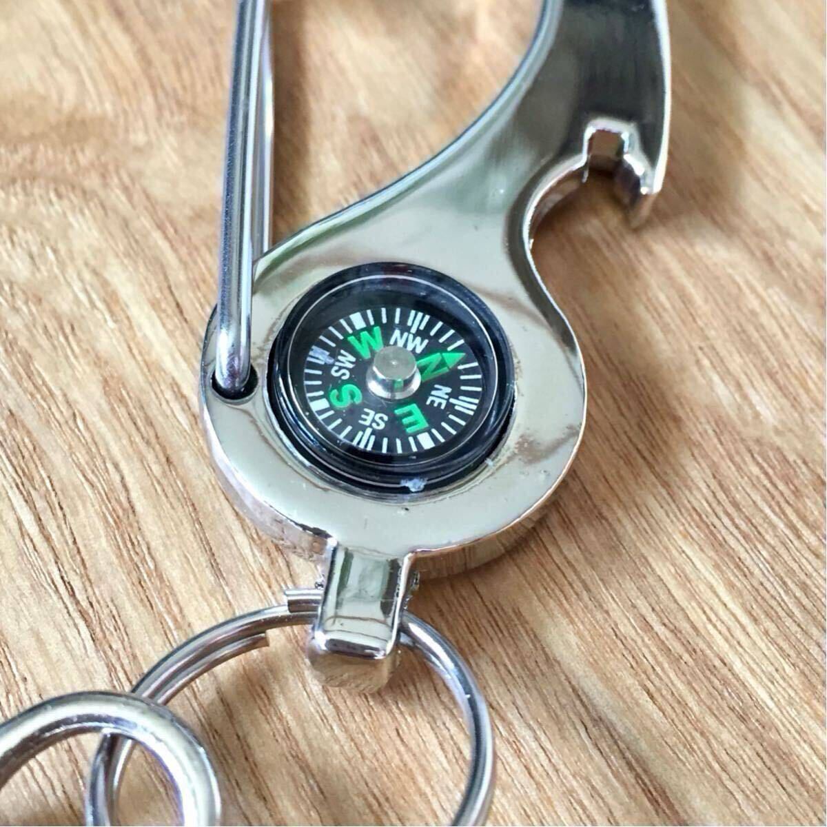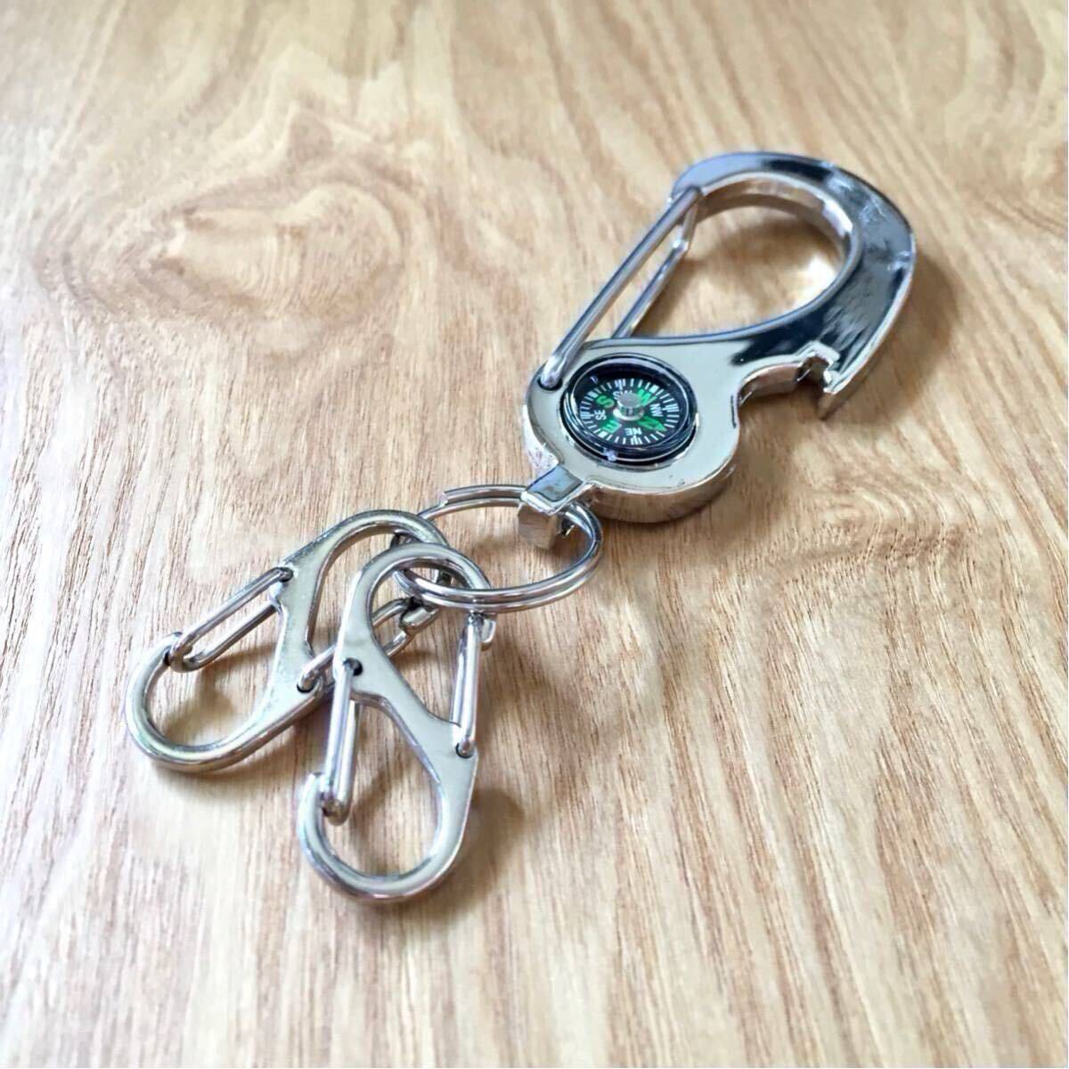 コンパスと栓抜きの機能が搭載された、カラビナキーホルダーです。
