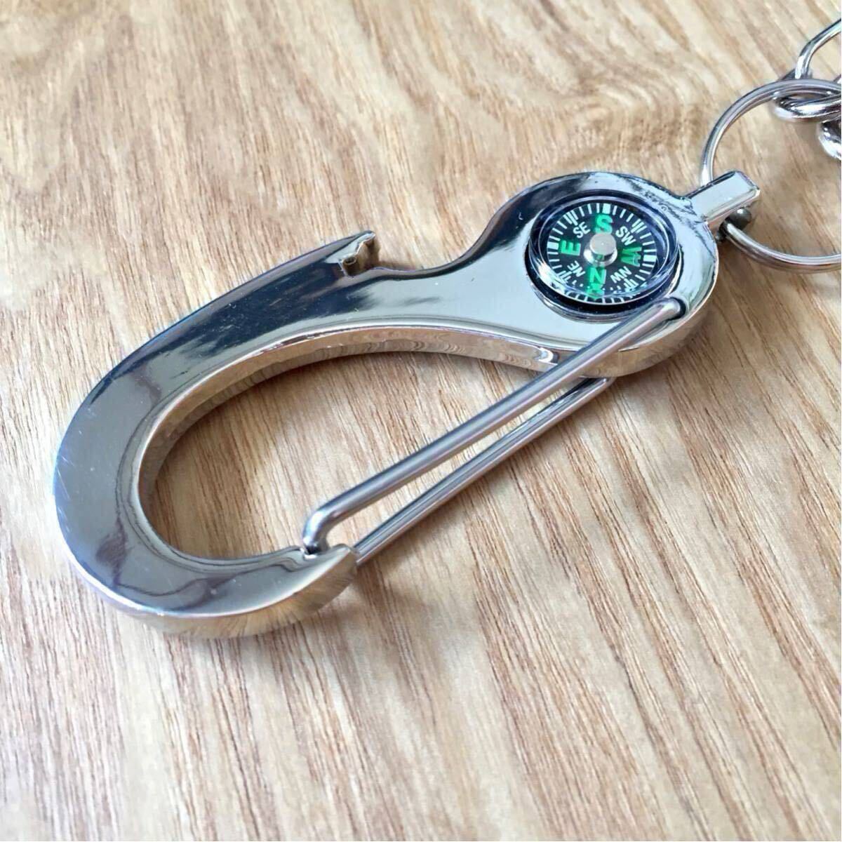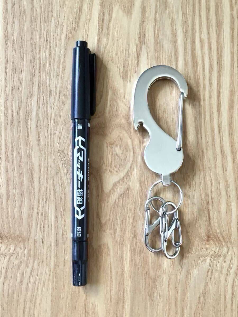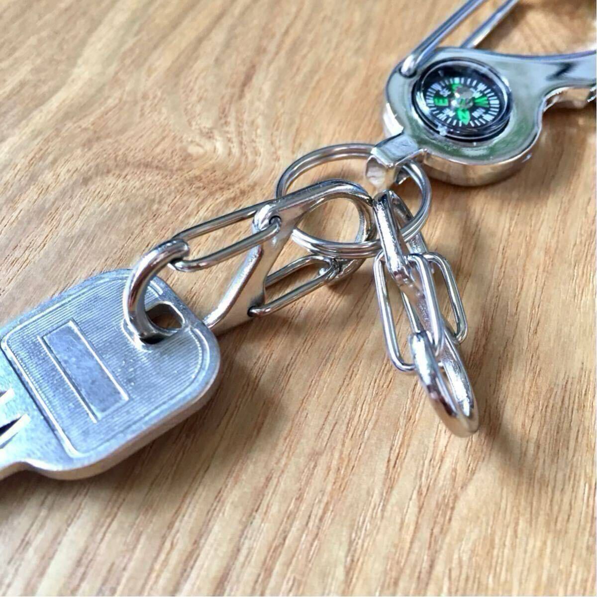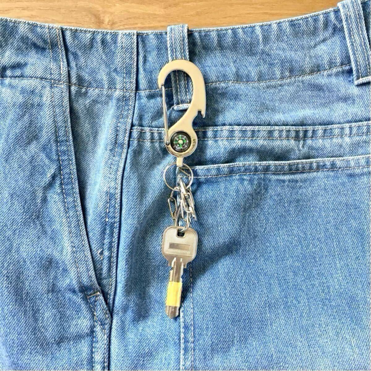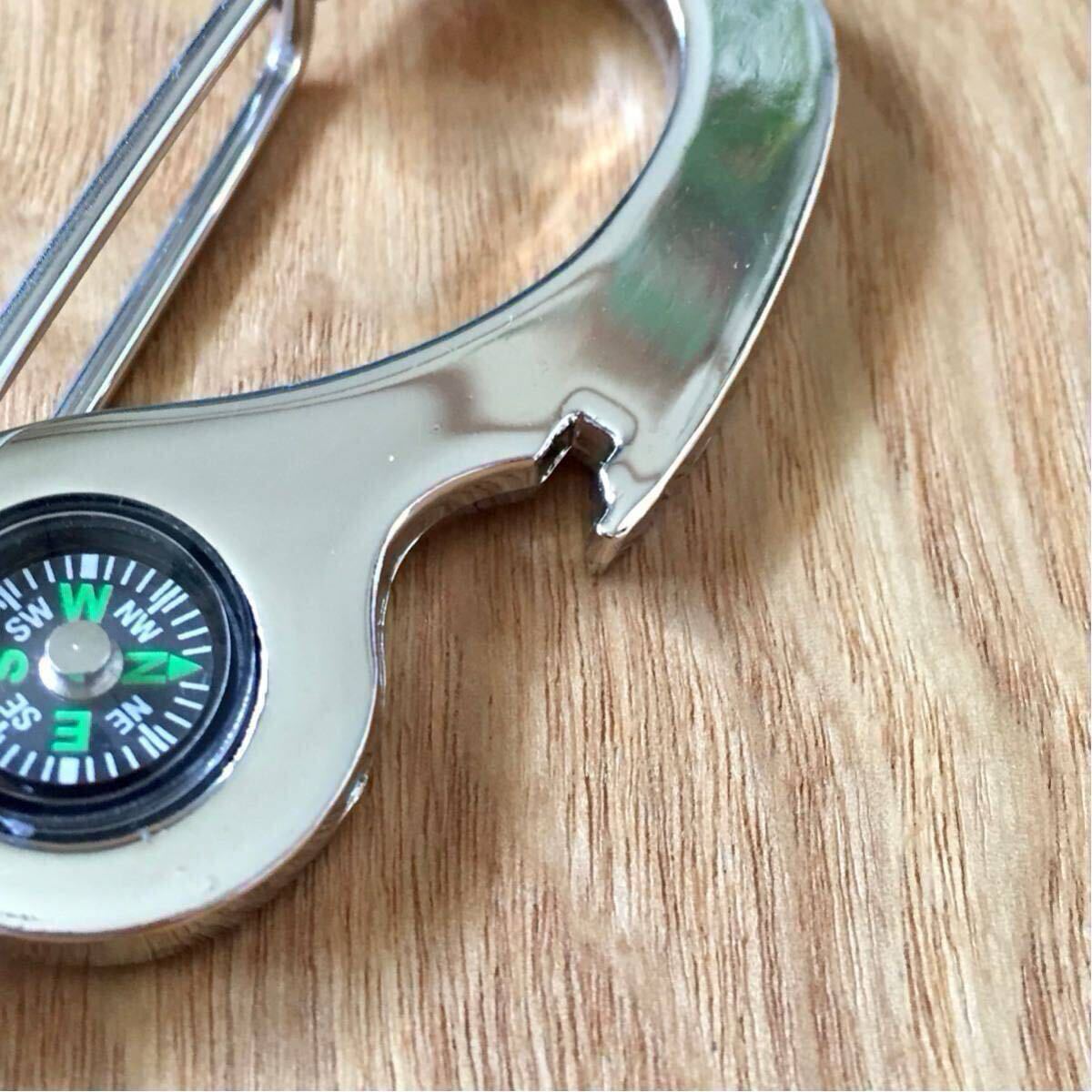 コンパスと栓抜きの機能が搭載された、カラビナキーホルダーです。