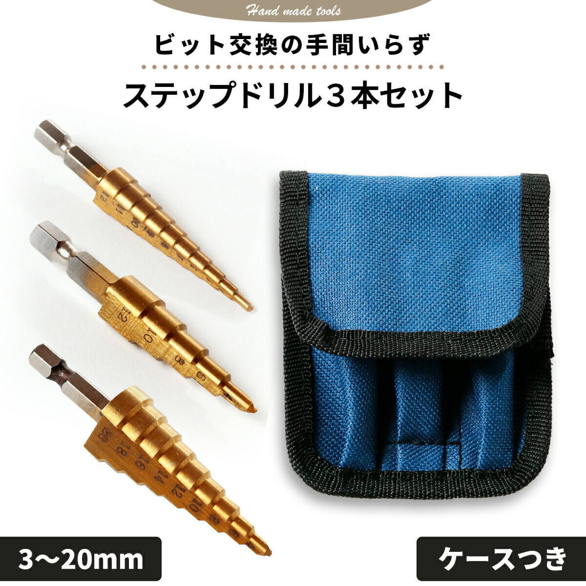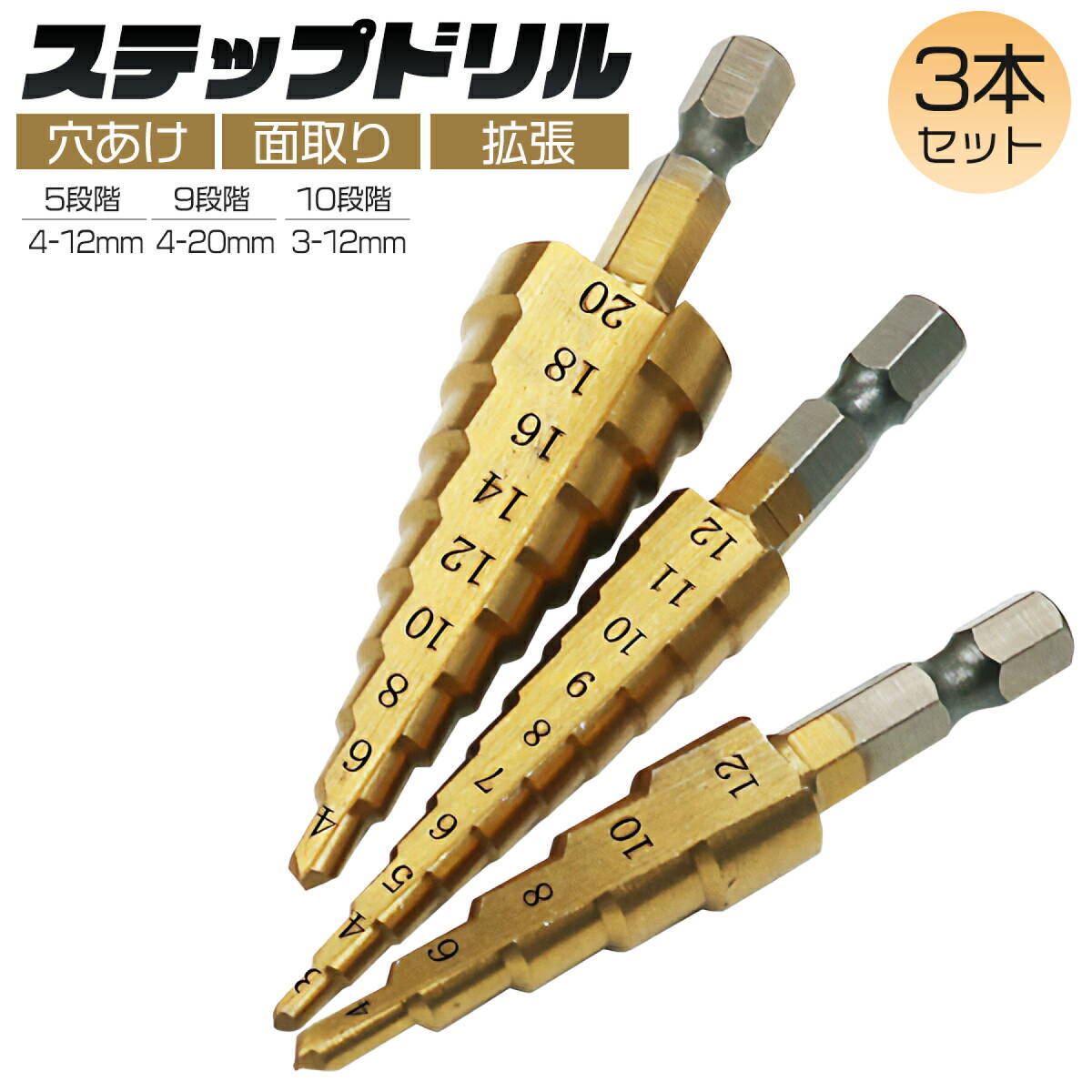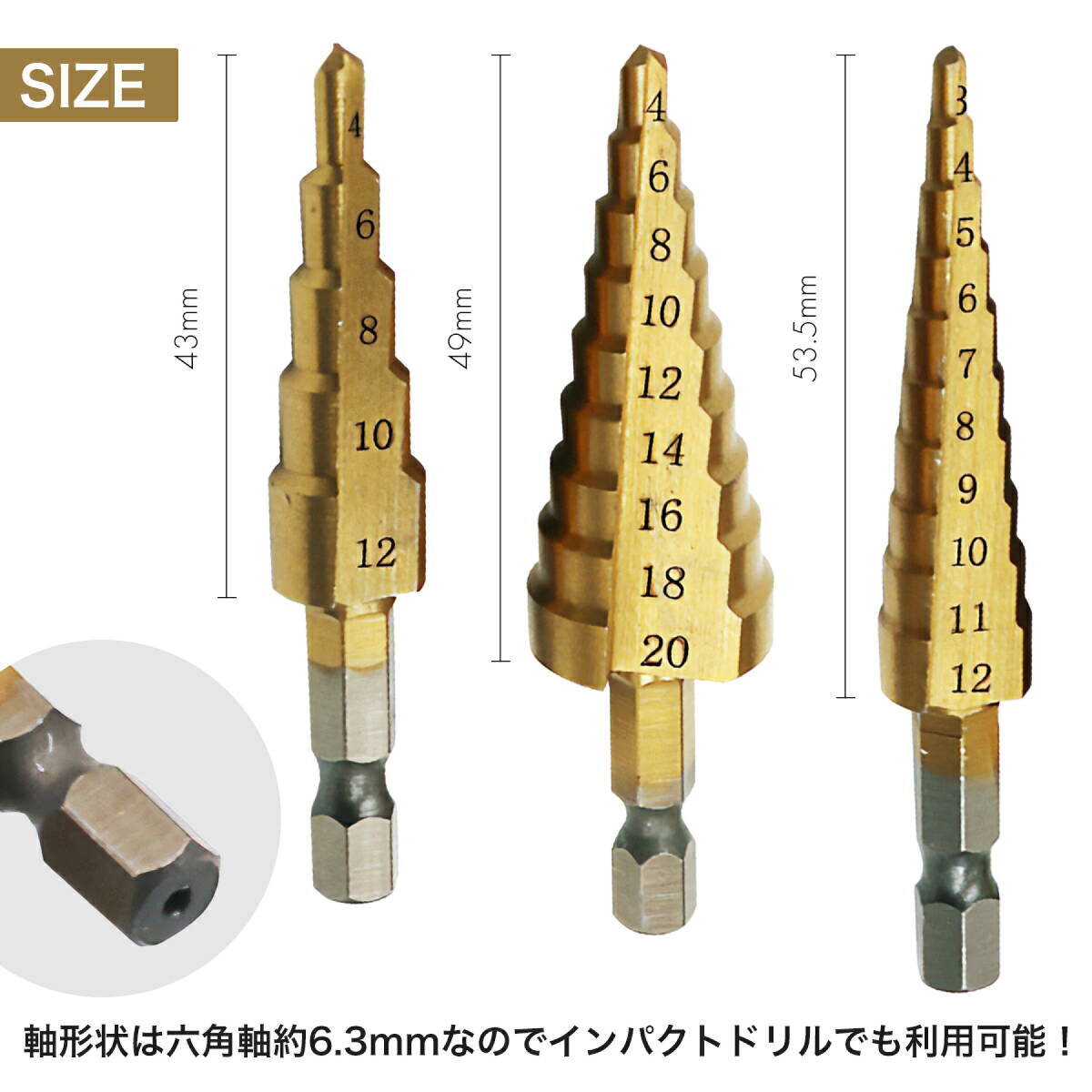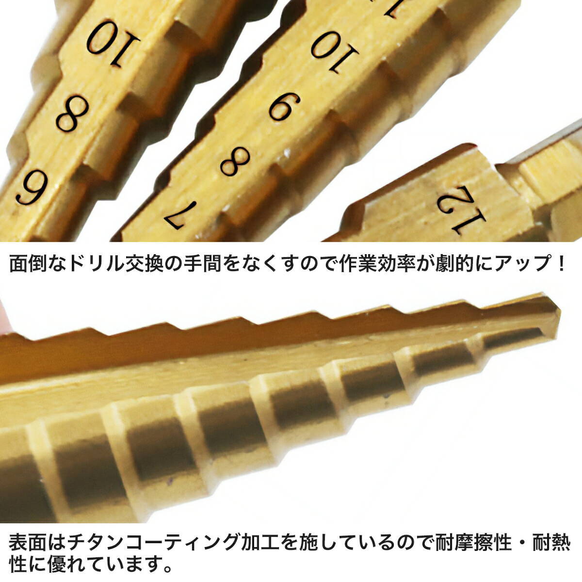 HSSステップドリル 3本セット チタンコーティング HSS鋼 穴あけ 面取り 穴拡大 タケノコドリル HSSステップドリル